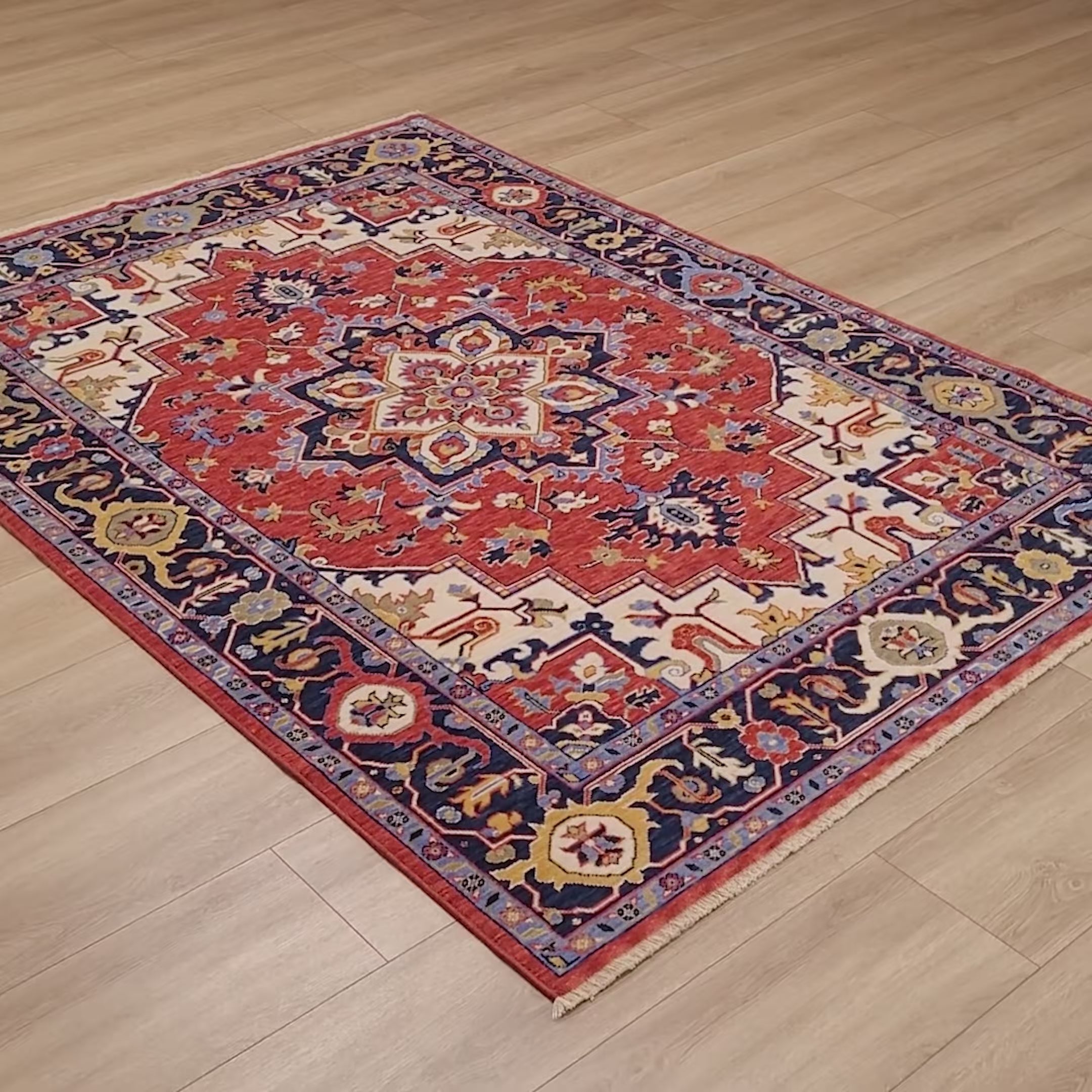 The Tempus Series Anatolian Medallion Patterned Red Wool Special Loom Carpet, bearing the tree of life symbol showing that it was woven specially for Halıcızade, was woven in the Aegean Region of Anatolia. This carpet, which is a combination of modern technology and deep-rooted weaving culture, attracts attention with its hand-woven appearance. The symmetrical patterns in the middle of this carpet, decorated with shades of white and blue on the main color red, are adorned with flower motifs reflecting the heritage and history of Anatolia. Tempus Series adds a unique style to your home with its authentic patterns, adapting to any space with different size options that include Halıcızade's 20 years of experience.