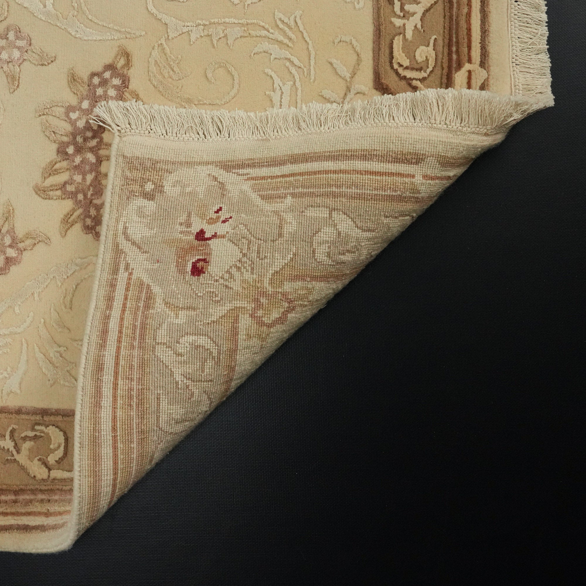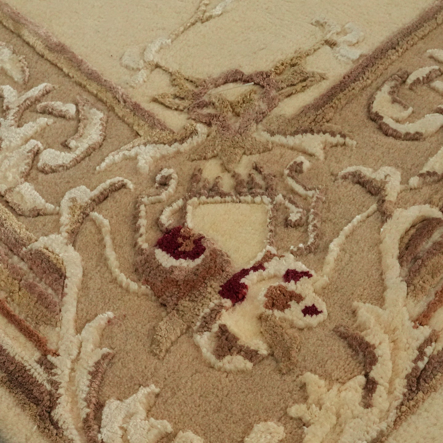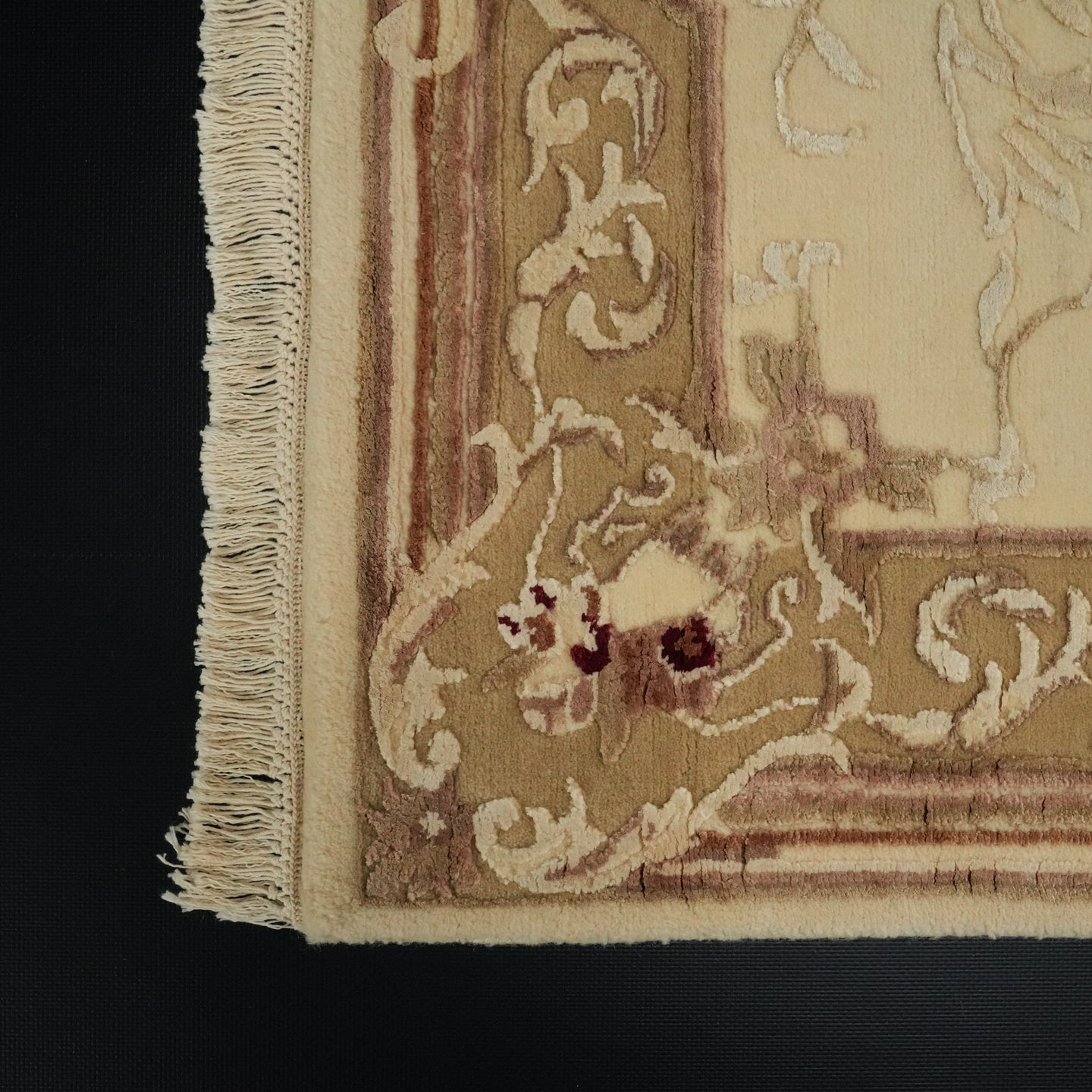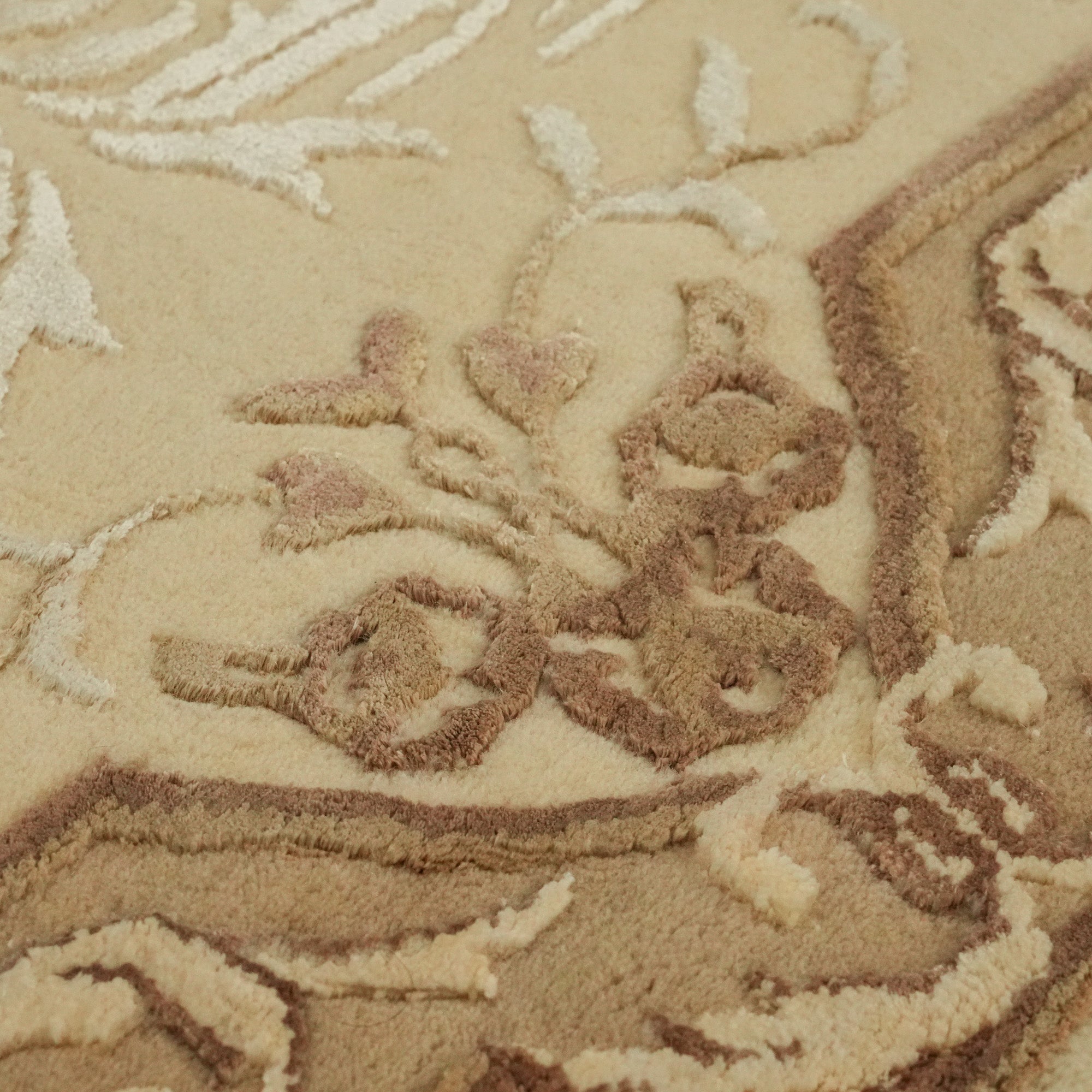 Having a high knot density allows the patterns to appear more distinct and ensures long-lasting use. The color palette of the Handwoven Cream Frame Patterned Wool Rug is created with soft pastel tones. The soothing combination of cream, beige, mink, and golden yellow easily complements furniture in cream and coffee tones. The modernized interpretations of traditional Uşak patterns in the Handwoven Cream Frame Patterned Wool Rug add both a classic and contemporary air to the design.