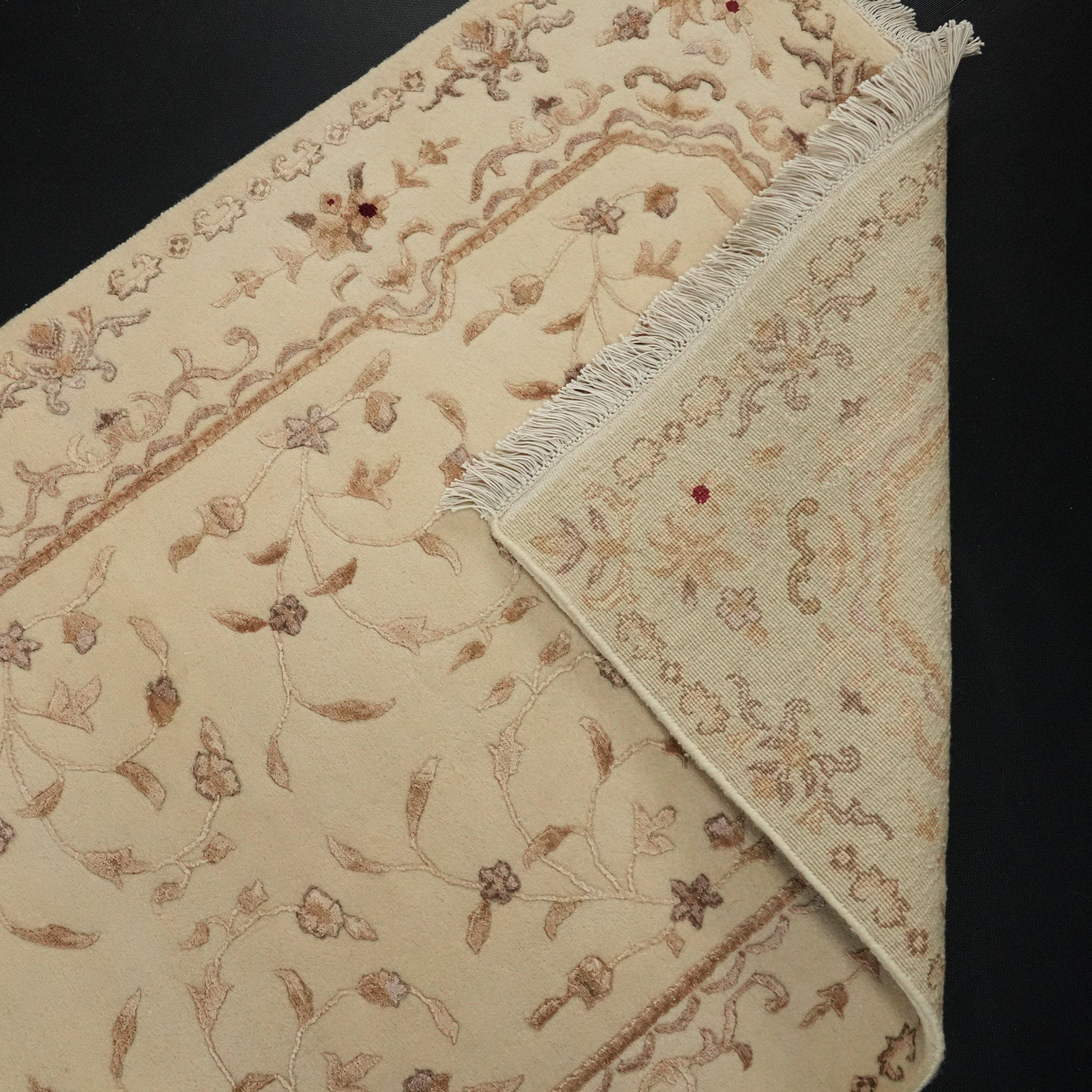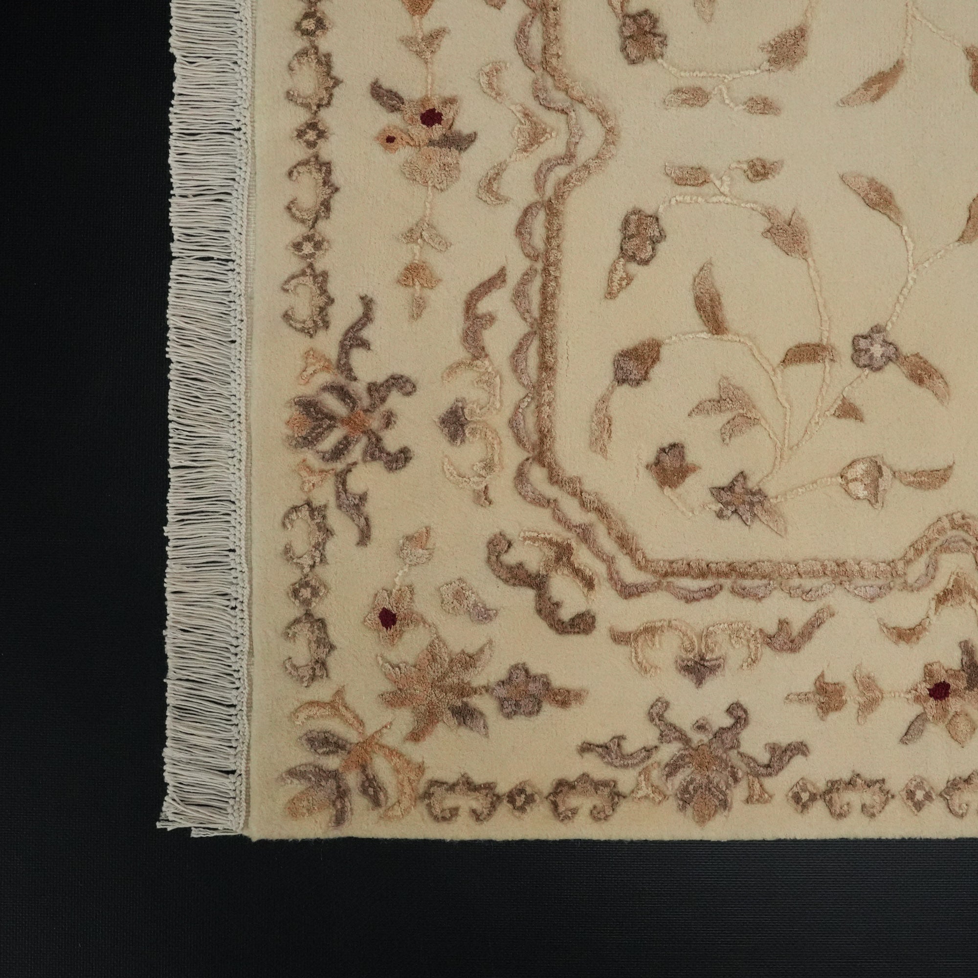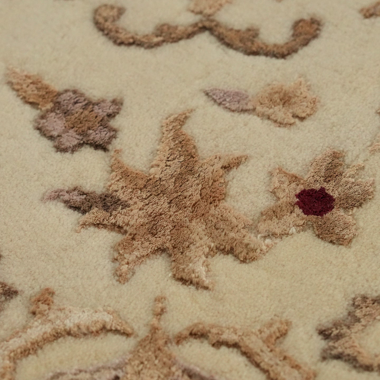 The Handwoven Cream Floral Patterned Wool Rug is a high-end handwoven rug that combines elegance and simplicity. The design, produced with meticulous work by master artisans in India, draws attention with its dense knot density and clearly reveals elegant patterns. The rug, made entirely with natural yarns, stands out with its 100% wool surface and silky shiny patterns obtained with viscose yarns. Cotton is used in the skeleton part to increase durability. The design, which emerges after months of weaving process, adds timeless elegance to living spaces with its high-quality materials and aesthetic details.