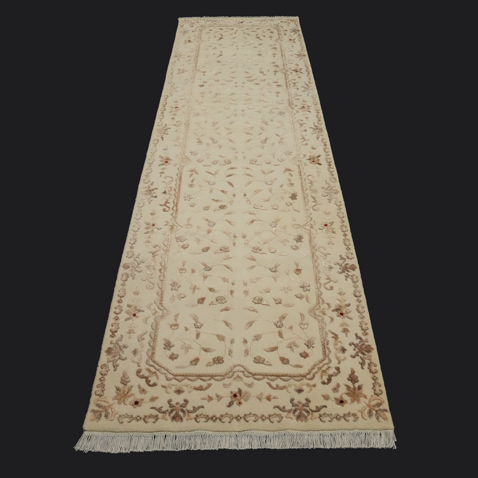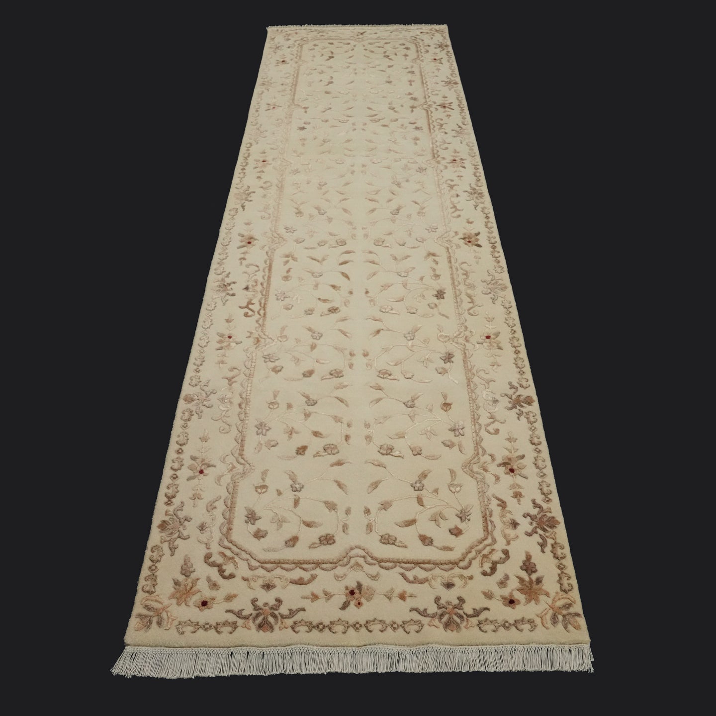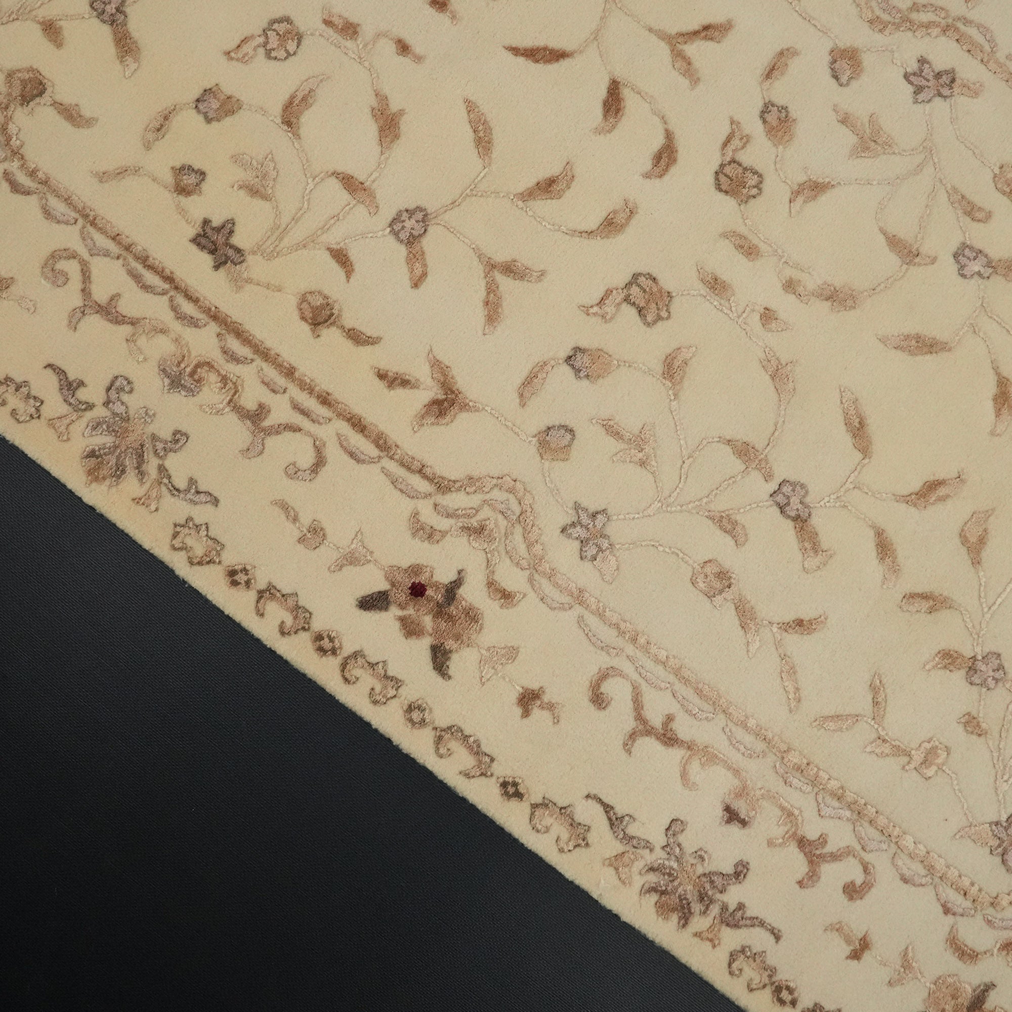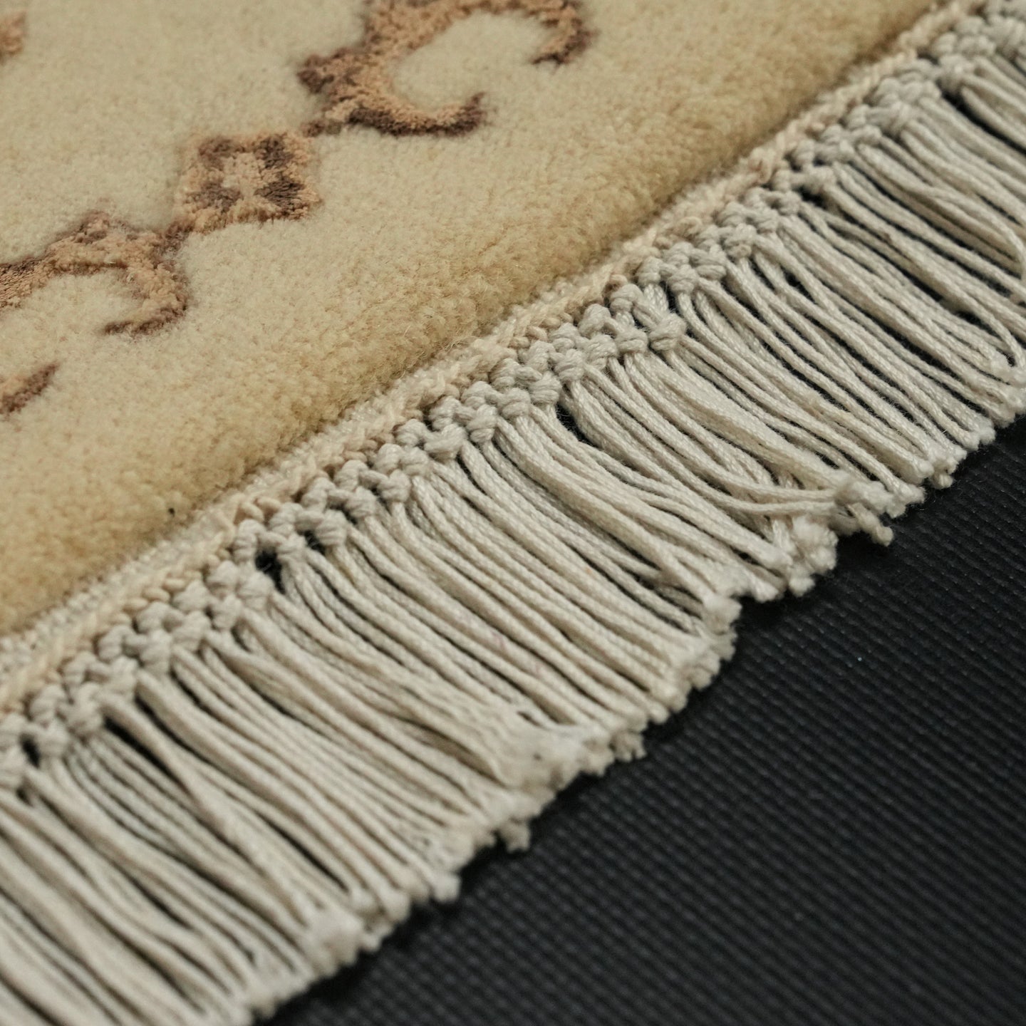 The Handwoven Cream Floral Patterned Wool Rug is a high-end handwoven rug that combines elegance and simplicity. The design, produced with meticulous work by master artisans in India, draws attention with its dense knot density and clearly reveals elegant patterns. The rug, made entirely with natural yarns, stands out with its 100% wool surface and silky shiny patterns obtained with viscose yarns. Cotton is used in the skeleton part to increase durability. The design, which emerges after months of weaving process, adds timeless elegance to living spaces with its high-quality materials and aesthetic details.