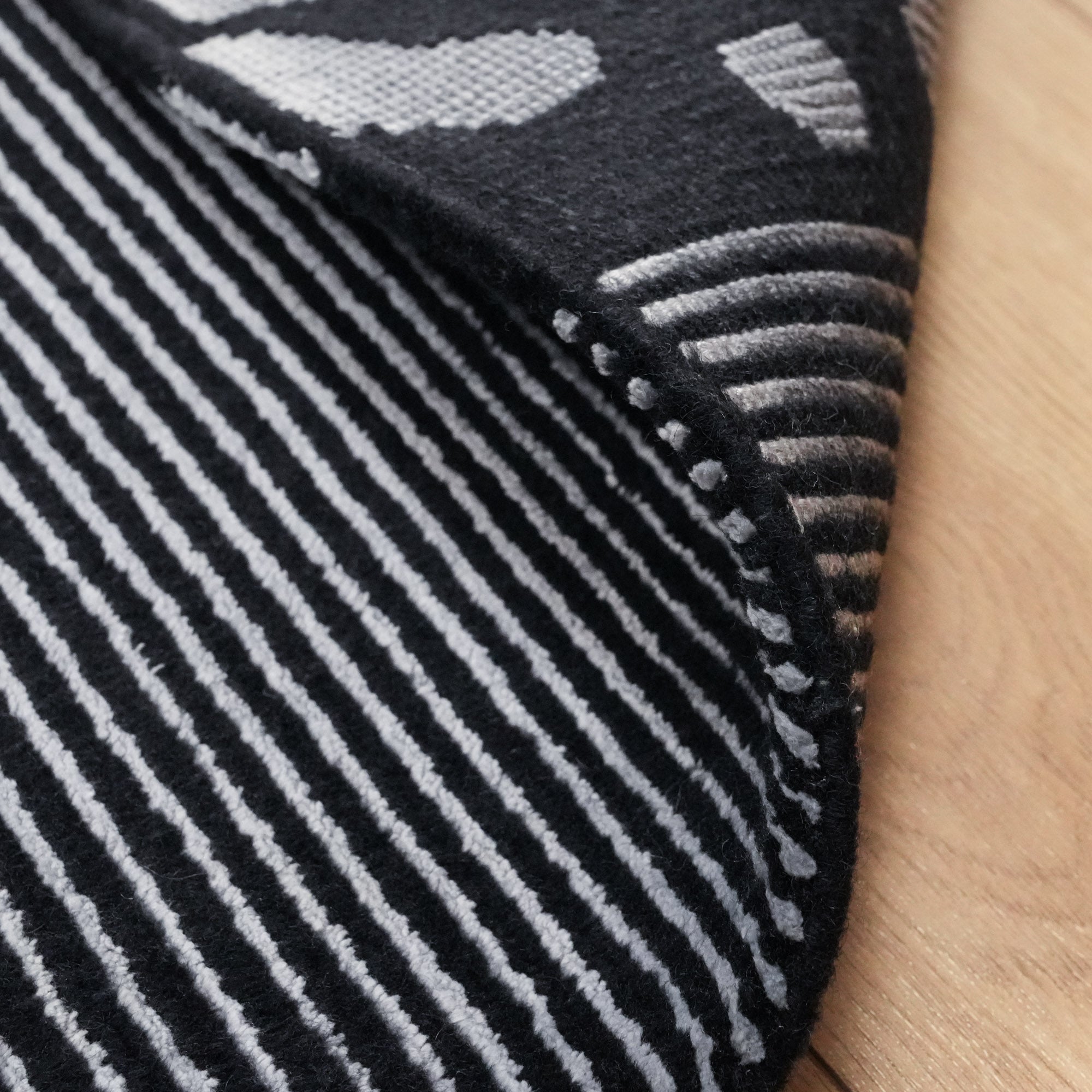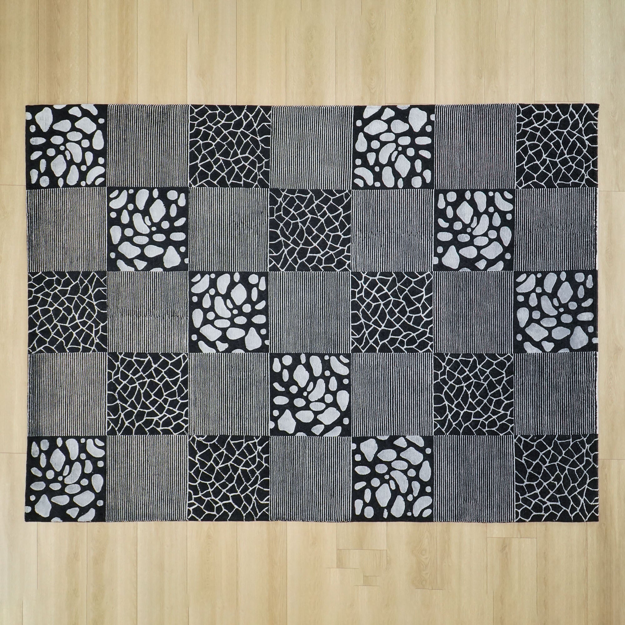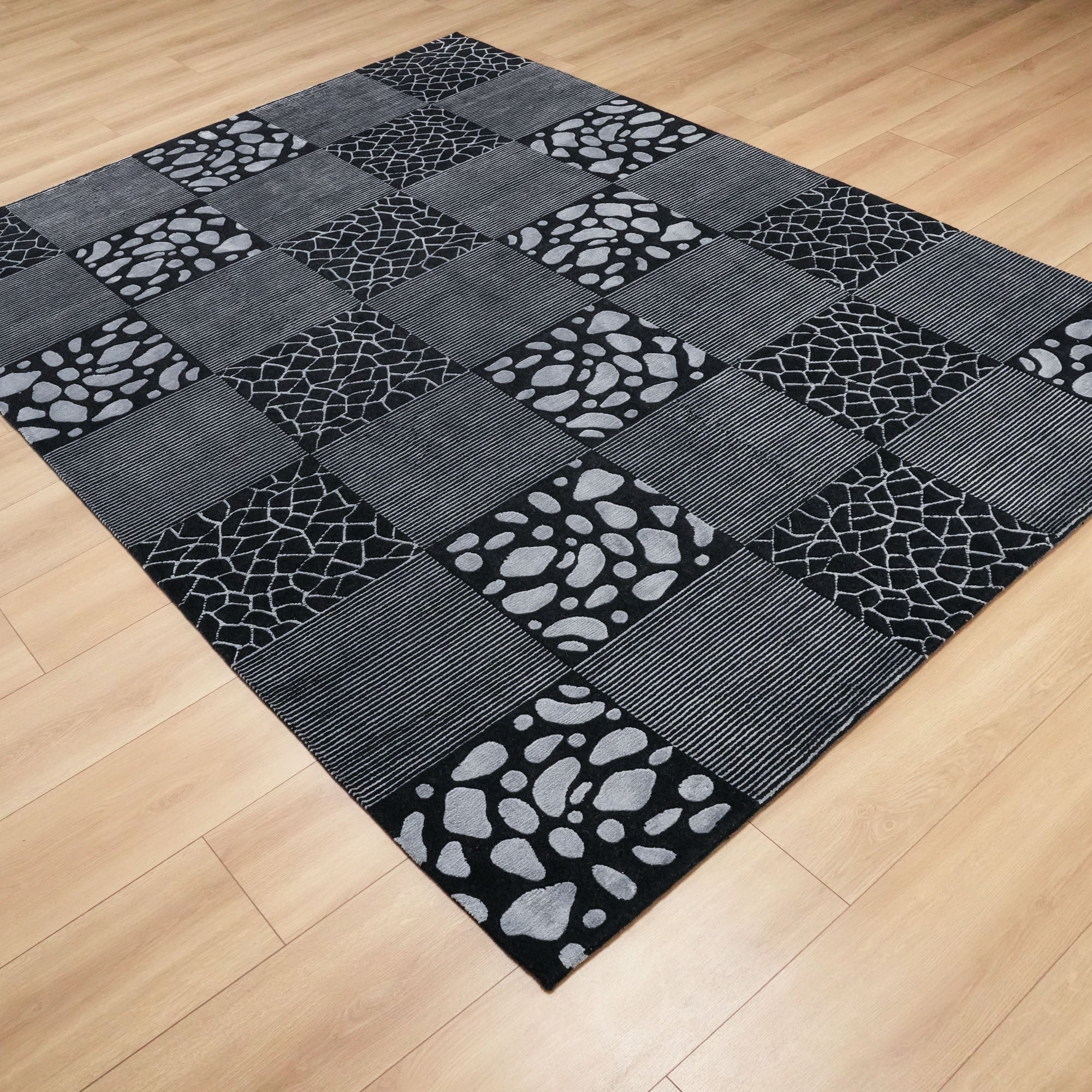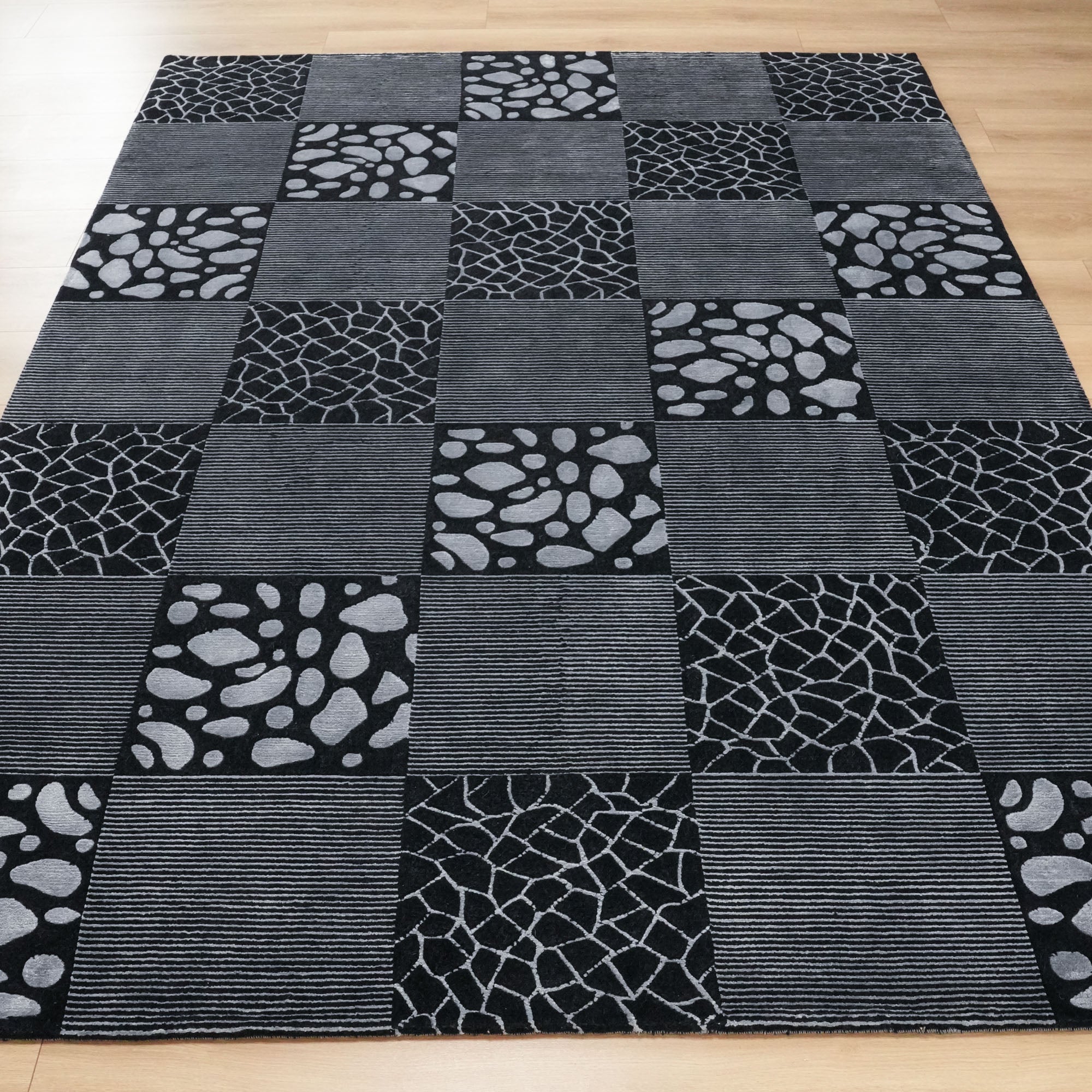 Handwoven Geometric Patterned Black Wool Rug, with its striking contrasts and multi-piece pattern structure, gives modern decorations a strong character. This 204 x 278 cm rug offers a dynamic and rhythmic appearance with gray tones and white patterns placed on a black background. Straight lines, natural stone forms, and web-like motifs come together to create a simple yet impressive surface. Gray areas become more distinct in daylight, while the black background appears softer. Natural plant fibers such as cotton, bamboo, and viscose provide softness. Thanks to wool yarns, it gains a sturdy and long-lasting structure. Since it is woven at the usual rug thickness, it can be comfortably used in many parts of the house except the kitchen. Each of these models, entirely handmade in India, is one of the unique pieces of the modern collection exclusive to Halıcızade. It is an ideal choice for those who want a dynamic and contemporary look.