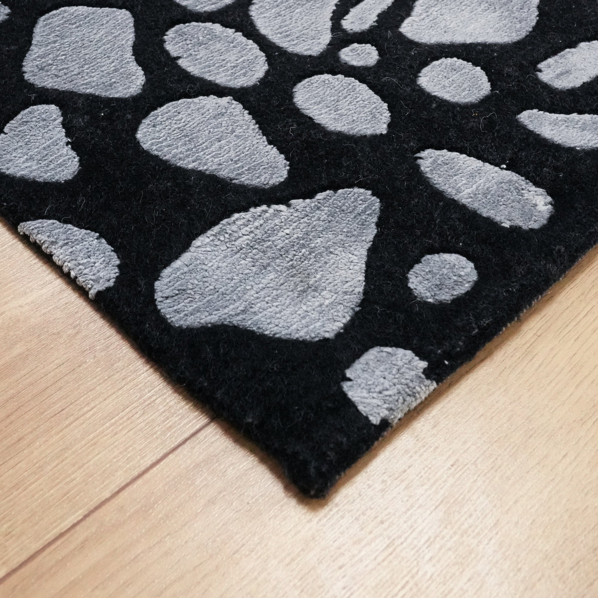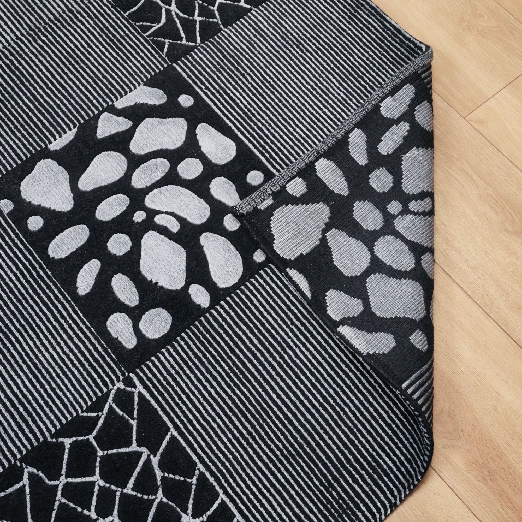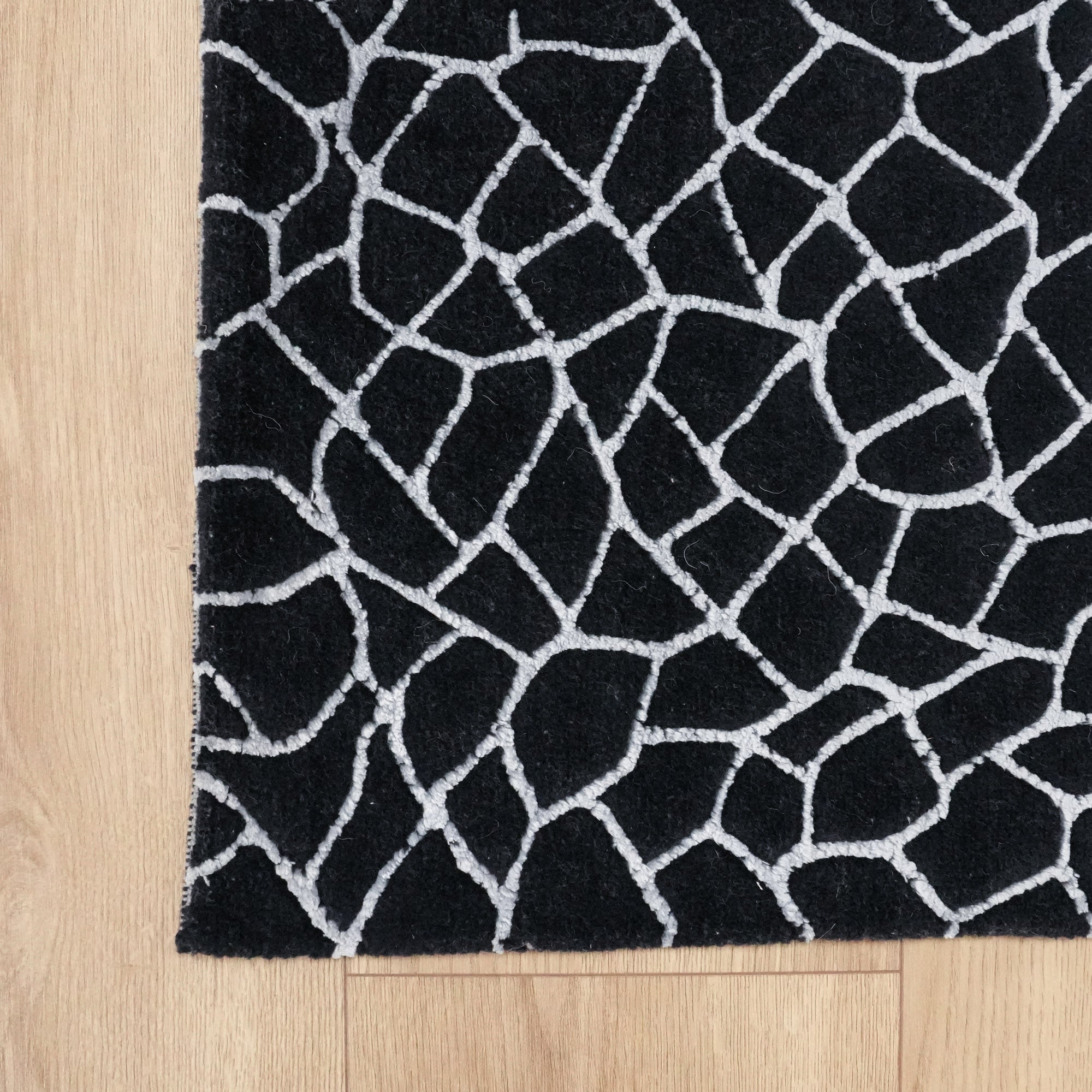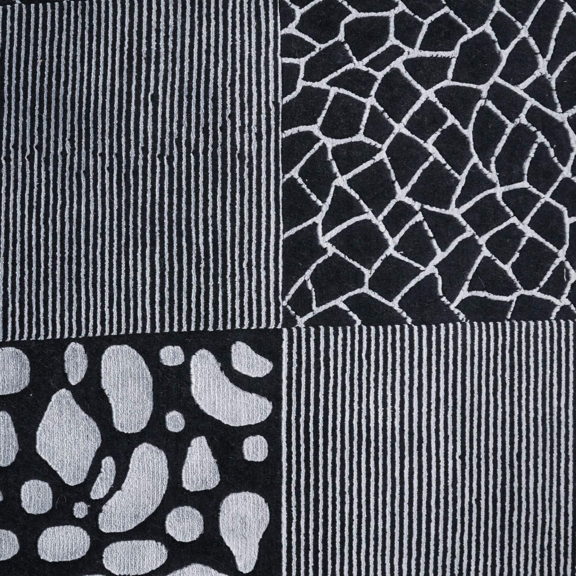 Handwoven Geometric Patterned Black Wool Rug, with its striking contrasts and multi-piece pattern structure, gives modern decorations a strong character. This 204 x 278 cm rug offers a dynamic and rhythmic appearance with gray tones and white patterns placed on a black background. Straight lines, natural stone forms, and web-like motifs come together to create a simple yet impressive surface. Gray areas become more distinct in daylight, while the black background appears softer. Natural plant fibers such as cotton, bamboo, and viscose provide softness. Thanks to wool yarns, it gains a sturdy and long-lasting structure. Since it is woven at the usual rug thickness, it can be comfortably used in many parts of the house except the kitchen. Each of these models, entirely handmade in India, is one of the unique pieces of the modern collection exclusive to Halıcızade. It is an ideal choice for those who want a dynamic and contemporary look.