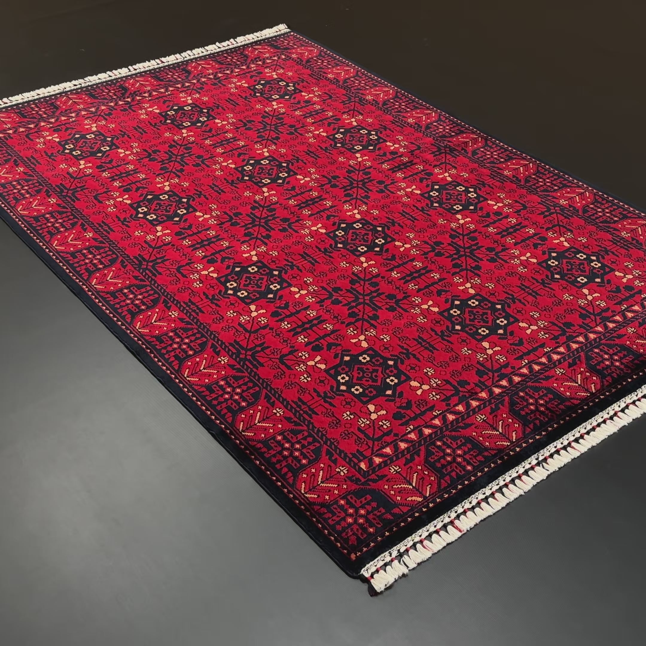 Nostalgia Series Afghan Türkmen Patterned Burgundy Loom Woven Rug, welcomes guests in living spaces with the enchanting warmth of Burgundy. This rich color tone, combined with dark navy blue patterns, sometimes gives a deep velvet feeling and sometimes reminds of the sparkle of fire. The small cream details hidden inside sprinkle a light glow over this intense color harmony. Burgundy creates a magnificent contrast not only with dark browns like walnut but also alongside white and cream furniture. Nostalgia, which offers both a locally produced and more economical option for those who want to lay an Afghan patterned rug, is one of the most laid rugs in Halıcızade's living spaces…