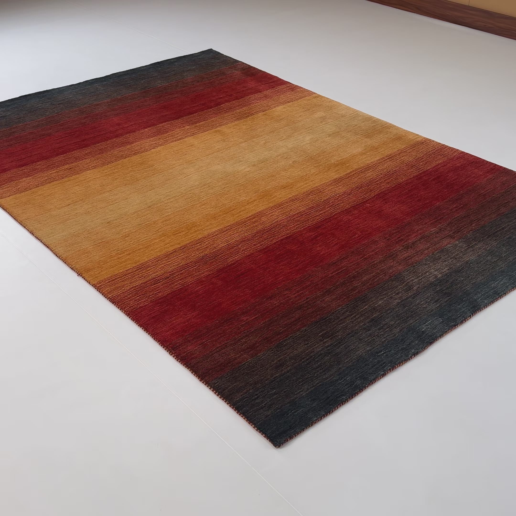 Plain Patterned Wool Terra Loom-Woven Rug, it carries a warm, authentic, and timeless character with color transitions inspired by nature. Starting from the golden tones of yellow, deepening with burnt brick, terra transitions leaning towards burgundy, and finally completed with night tones close to black, this design appeals to rich and bold spirits who do not want to stick to a single color. The colors on the surface connect to each other with tone-on-tone softness; it does not tire the eyes and adds vitality to the space. The warm honey tone in the very center of the rug warms the interior, the dark rust color on the side evokes passion, and the coal black at the edge brings depth and balance. Copper tones reminiscent of orange marmalade feel like a window facing the sunset.