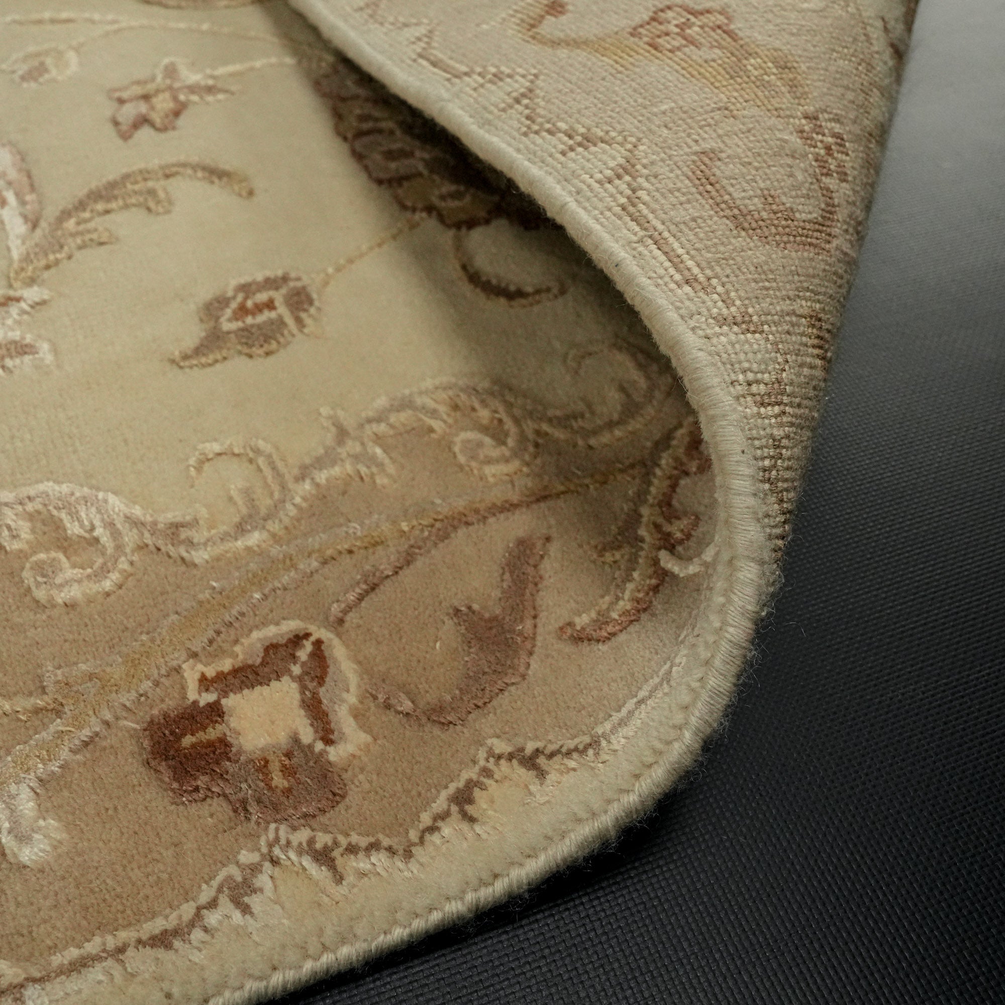 Renk paletinde yer alan krem, bej ve vizon tonları, altın sarısı ve pastel yeşil dokunuşlarla zenginleştirilmiştir. Çerçeve deseni ve yumuşak renk geçişleri, tasarımı hem klasik hem de modern bir atmosferin parçası haline getirir. Çiçekli ve ince desenlerle süslenen El Dokuma Çerçeve Desenli Krem Yün Halı, geleneksel Uşak motiflerinin modern yorumlarını taşır. Sade renk tonları, krem ve kahverengi mobilyalarla uyumlu bir görünüm sunar.
