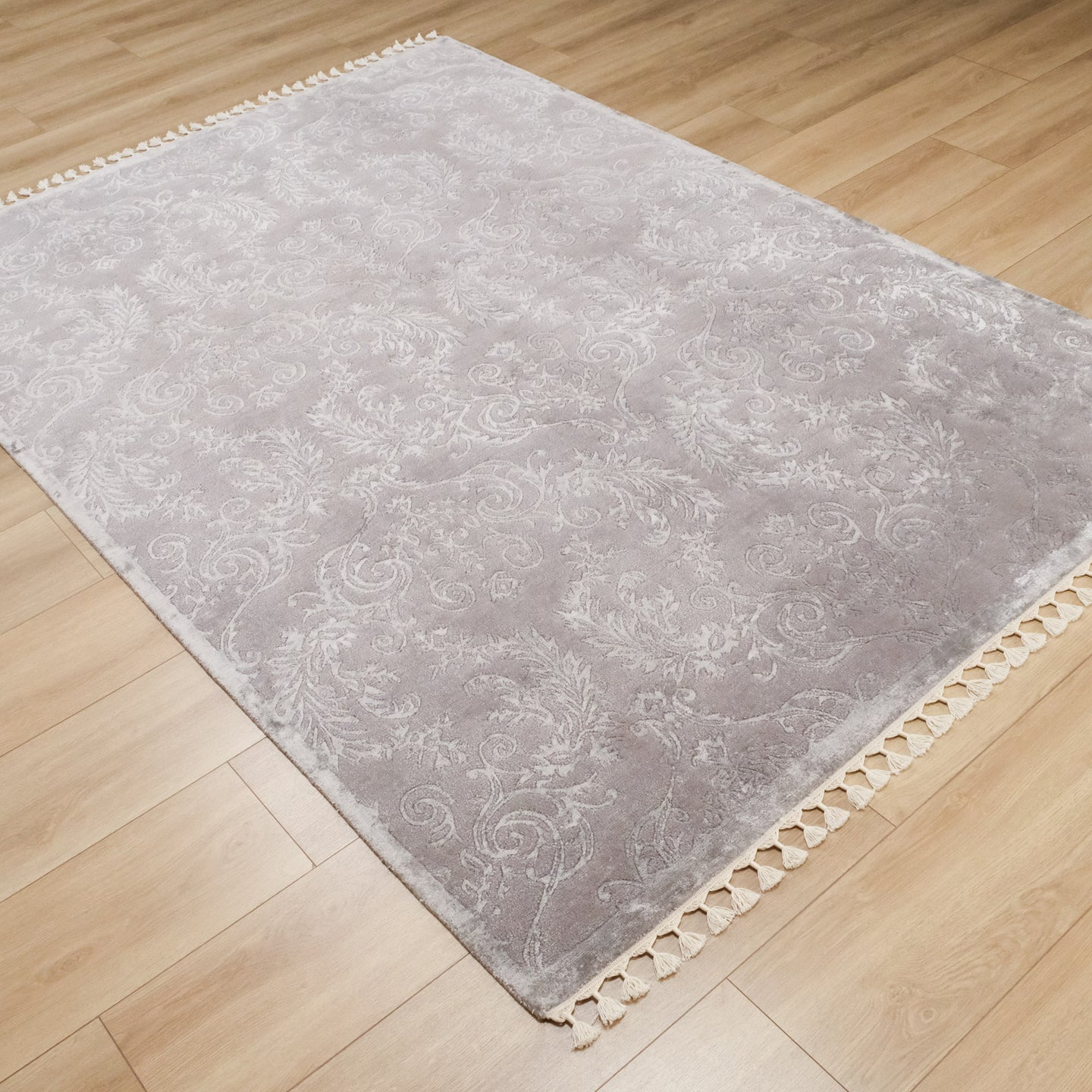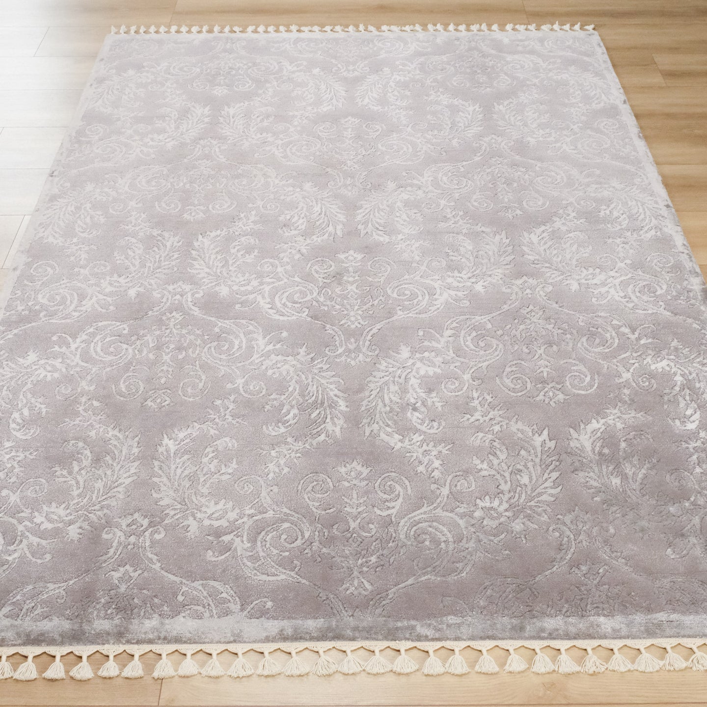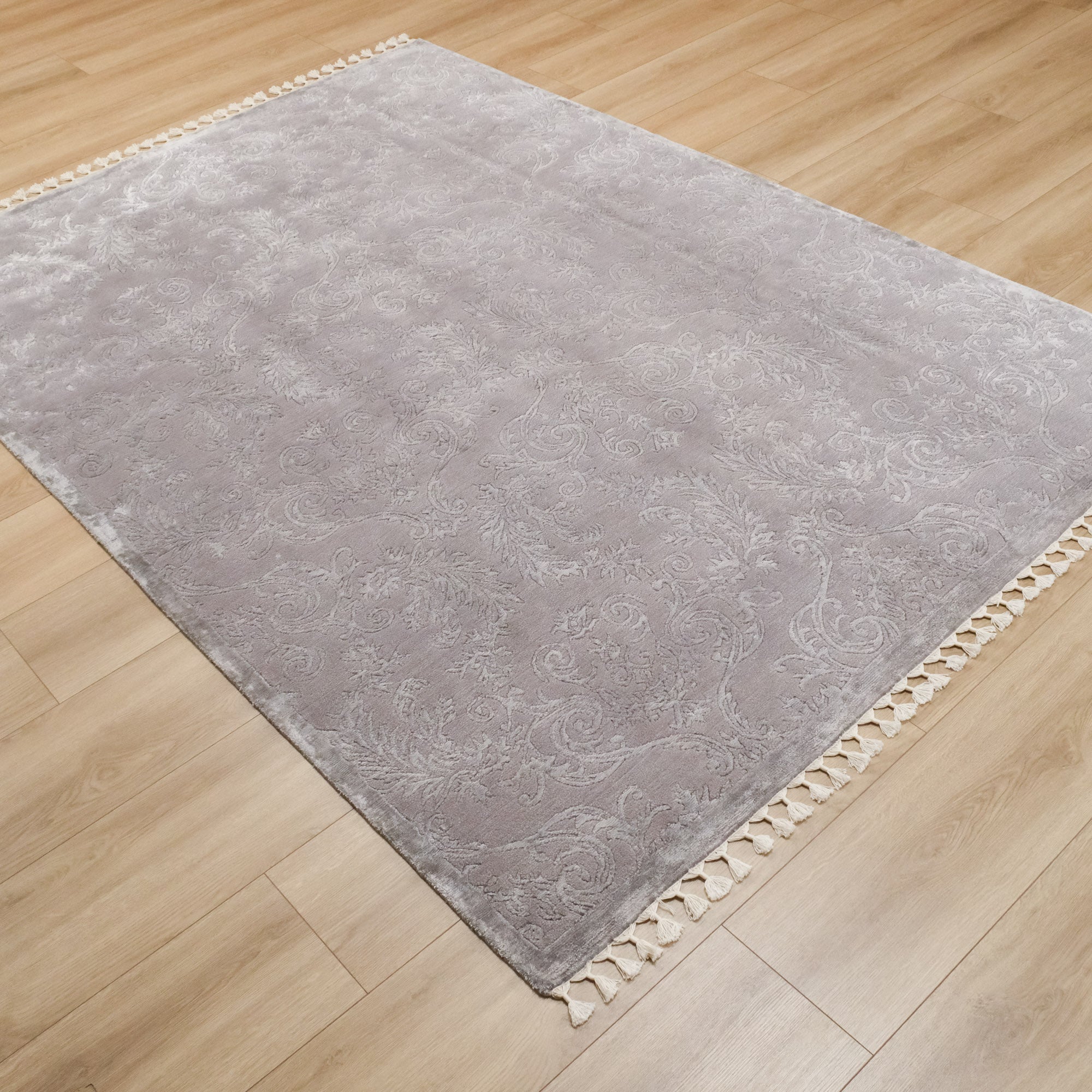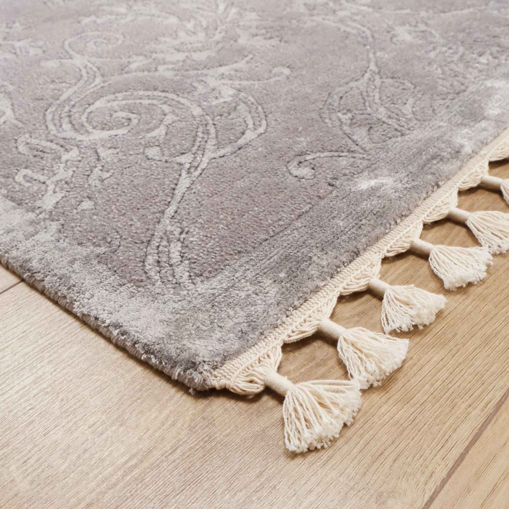 El Dokuma Damask Desenli Gri Halı, Halıcızade’ye özel olarak üretilen ve geleneksel el işçiliğini modern zarafetle birleştiren özel bir koleksiyonun parçasıdır. Gri zemin üzerine işlenen klasik damask desenler, bambu ipliklerin doğal parlaklığı sayesinde ışıkla birlikte kendini zarifçe belli eder. Pamuk iskelet üzerine yün, bambu ve pamuk ipliklerle dokunan bu halı, Hindistan’da yoğun düğüm sıklığıyla tamamen el emeğiyle üretilmiştir. Doğal ipliklerin sağladığı yumuşaklık, her adımda konfor hissi sunar ve pastel tonlu desenleriyle evinize zamansız bir şıklık kazandırır.