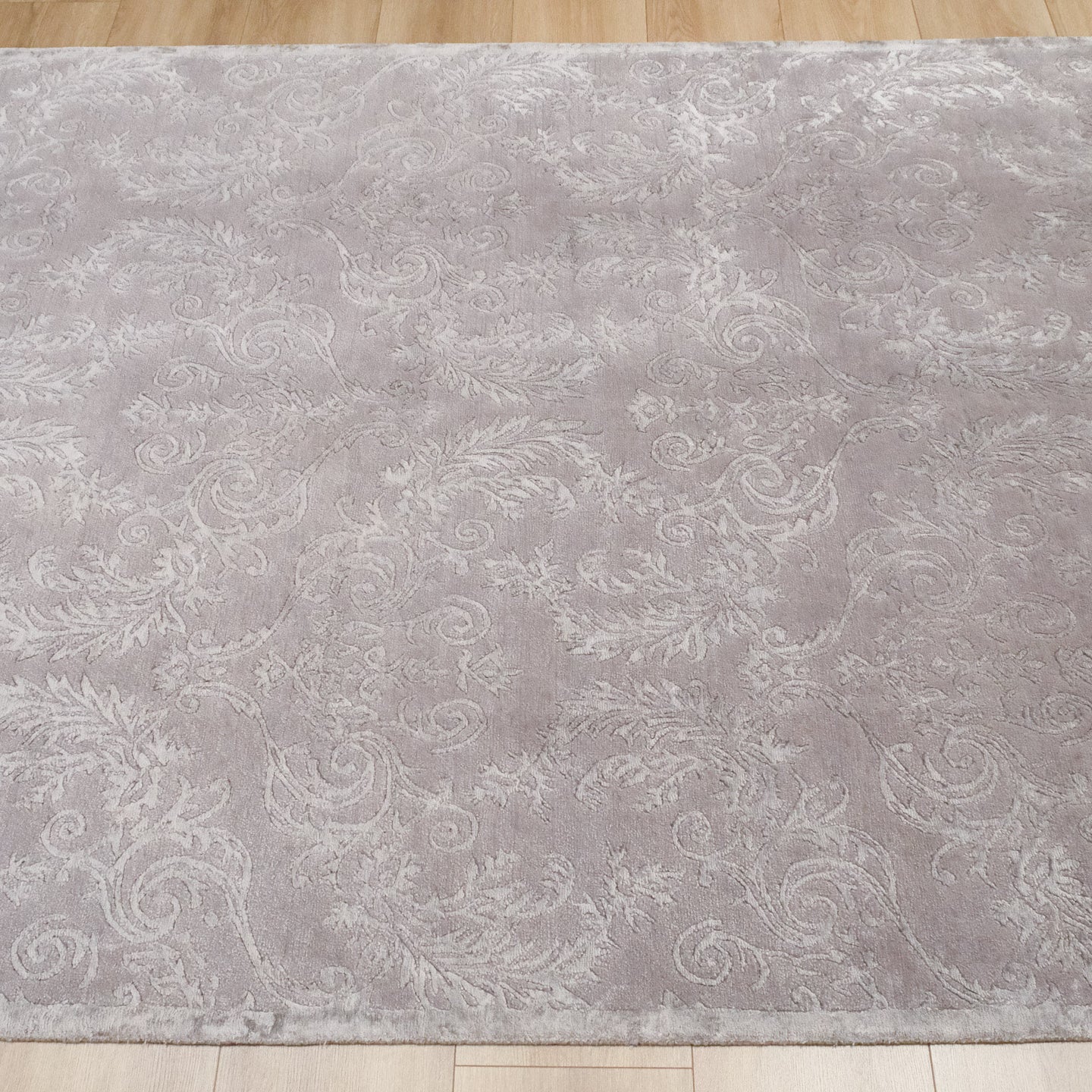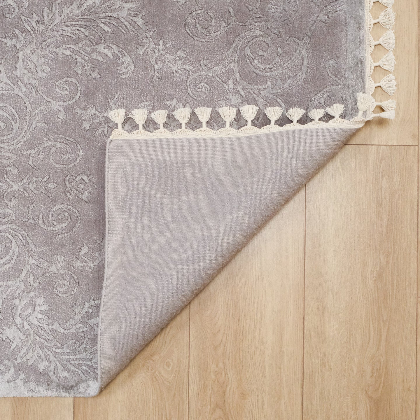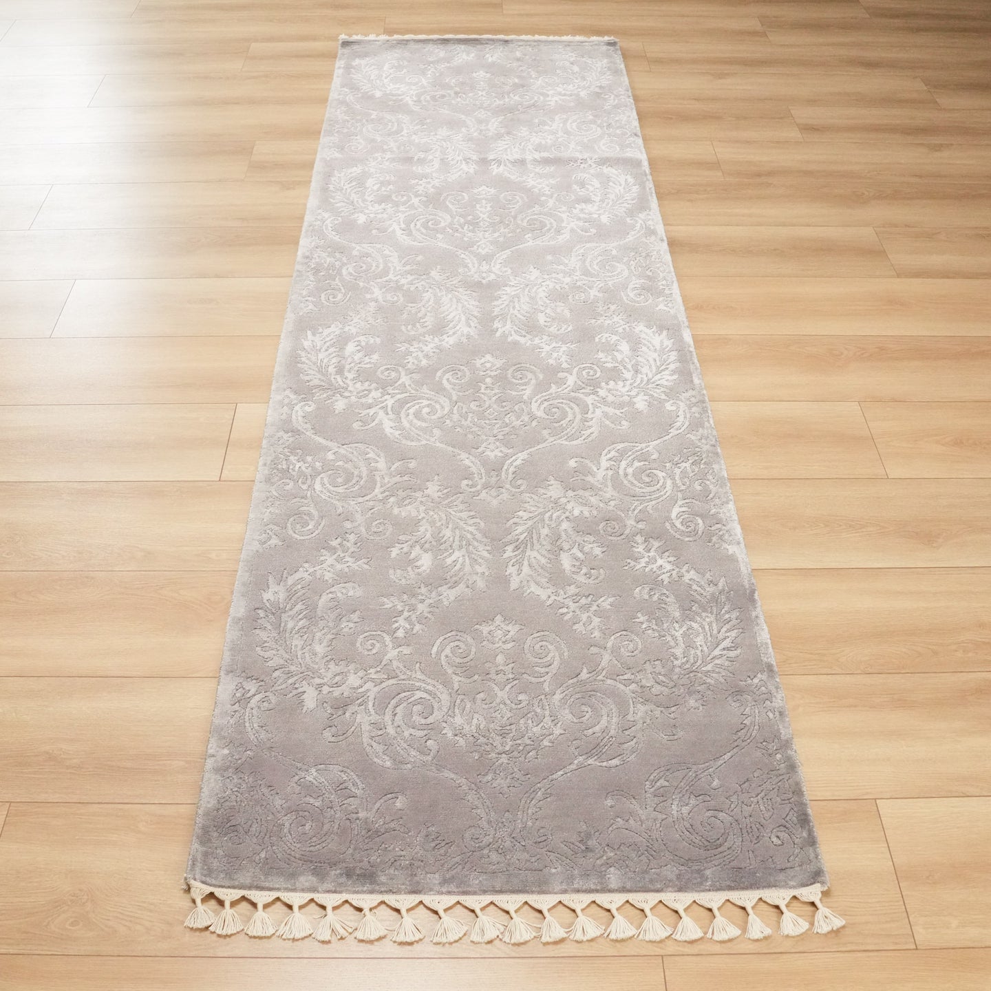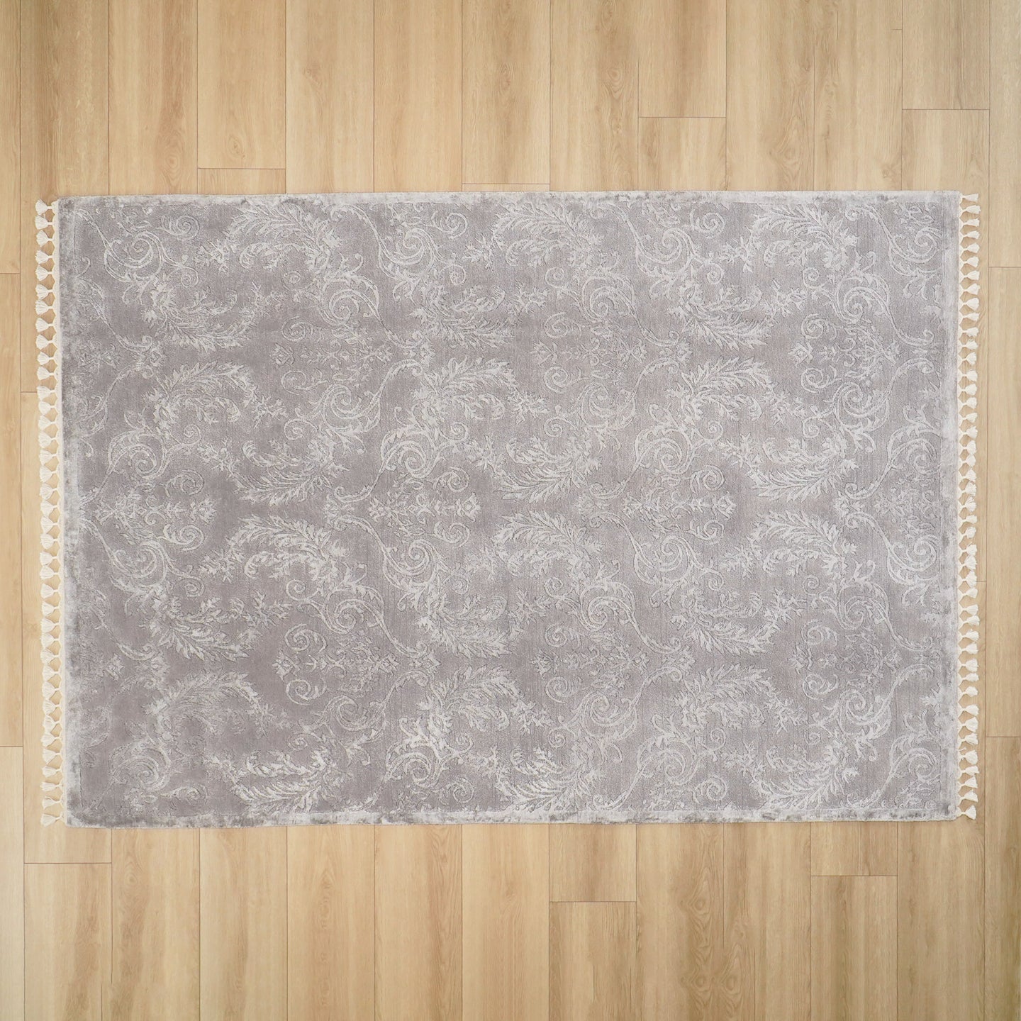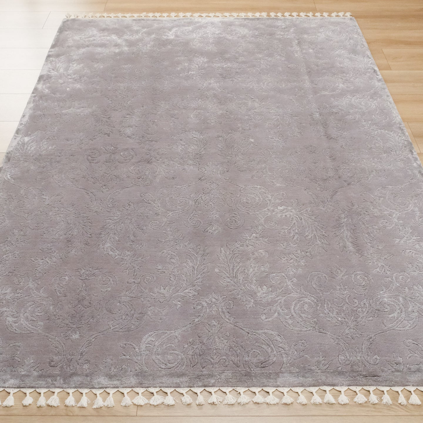 El Dokuma Damask Desenli Gri Halı, Halıcızade’ye özel olarak üretilen ve geleneksel el işçiliğini modern zarafetle birleştiren özel bir koleksiyonun parçasıdır. Gri zemin üzerine işlenen klasik damask desenler, bambu ipliklerin doğal parlaklığı sayesinde ışıkla birlikte kendini zarifçe belli eder. Pamuk iskelet üzerine yün, bambu ve pamuk ipliklerle dokunan bu halı, Hindistan’da yoğun düğüm sıklığıyla tamamen el emeğiyle üretilmiştir. Doğal ipliklerin sağladığı yumuşaklık, her adımda konfor hissi sunar ve pastel tonlu desenleriyle evinize zamansız bir şıklık kazandırır.