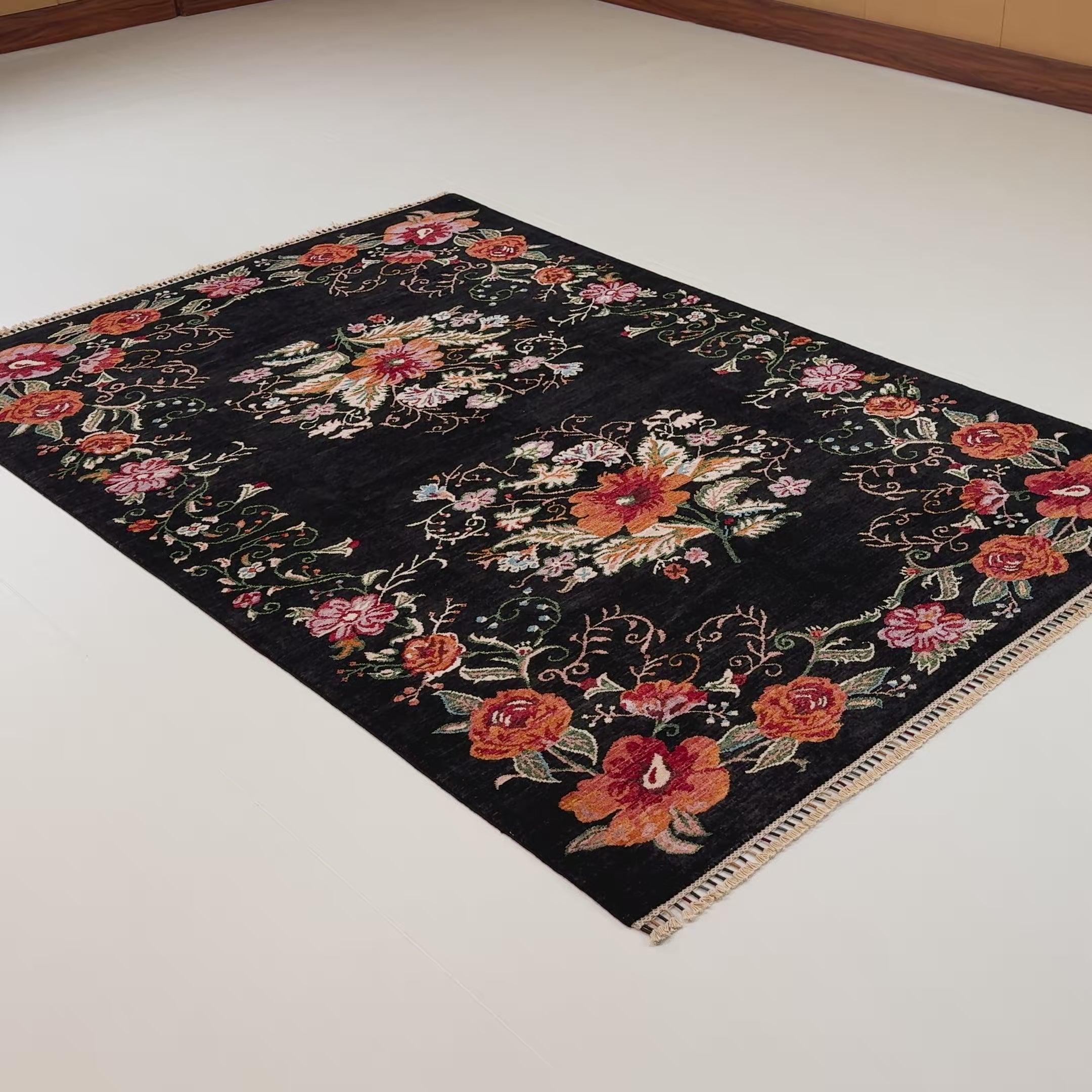 El Dokuma Siyah Karabağ Desenli Yün Siyah Halı