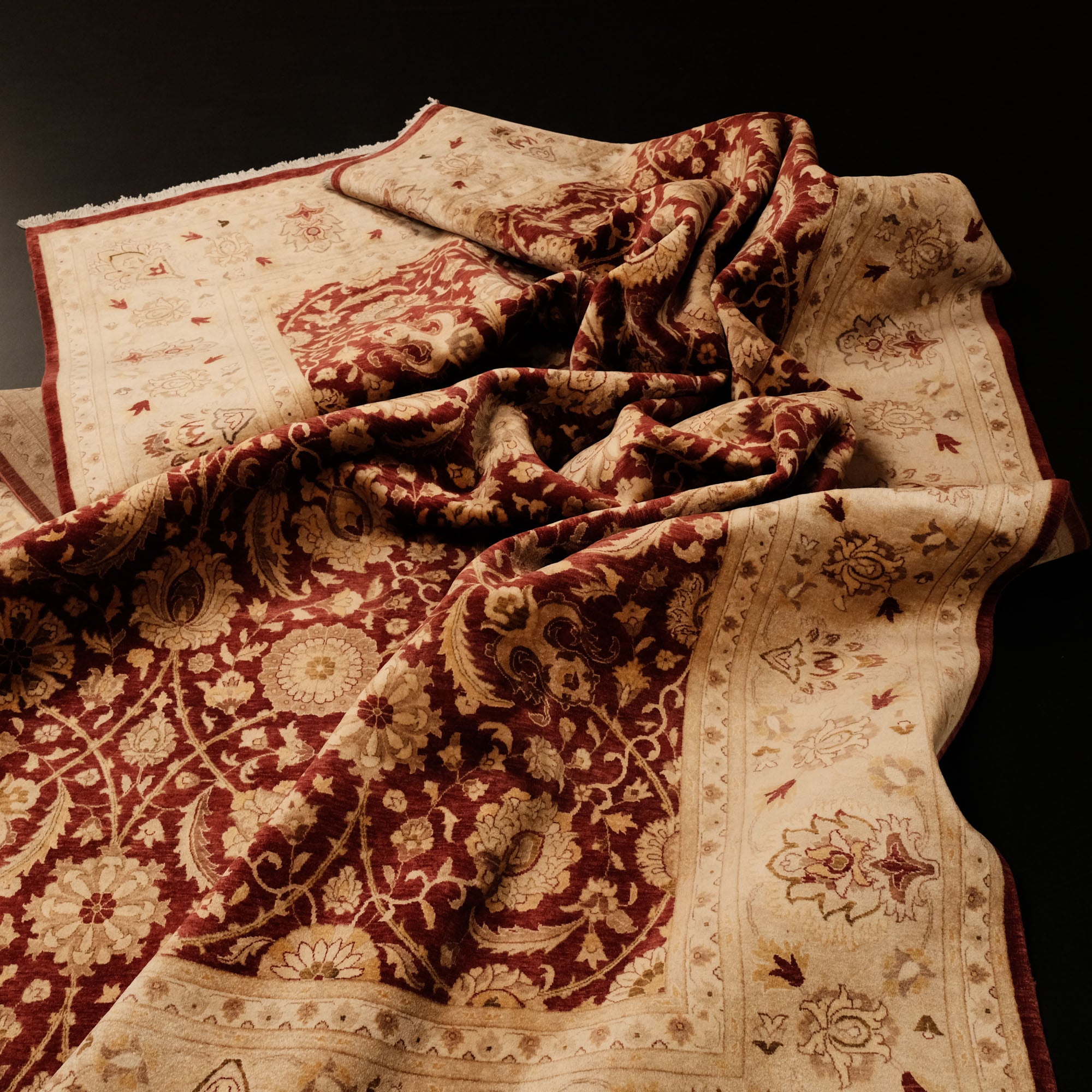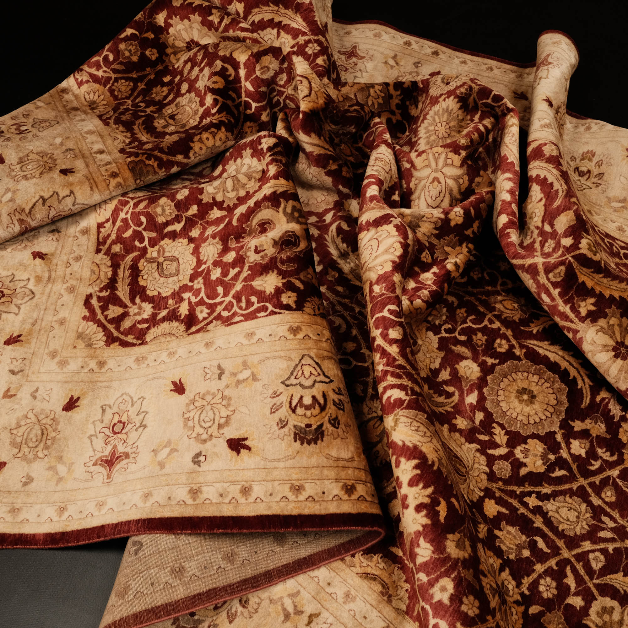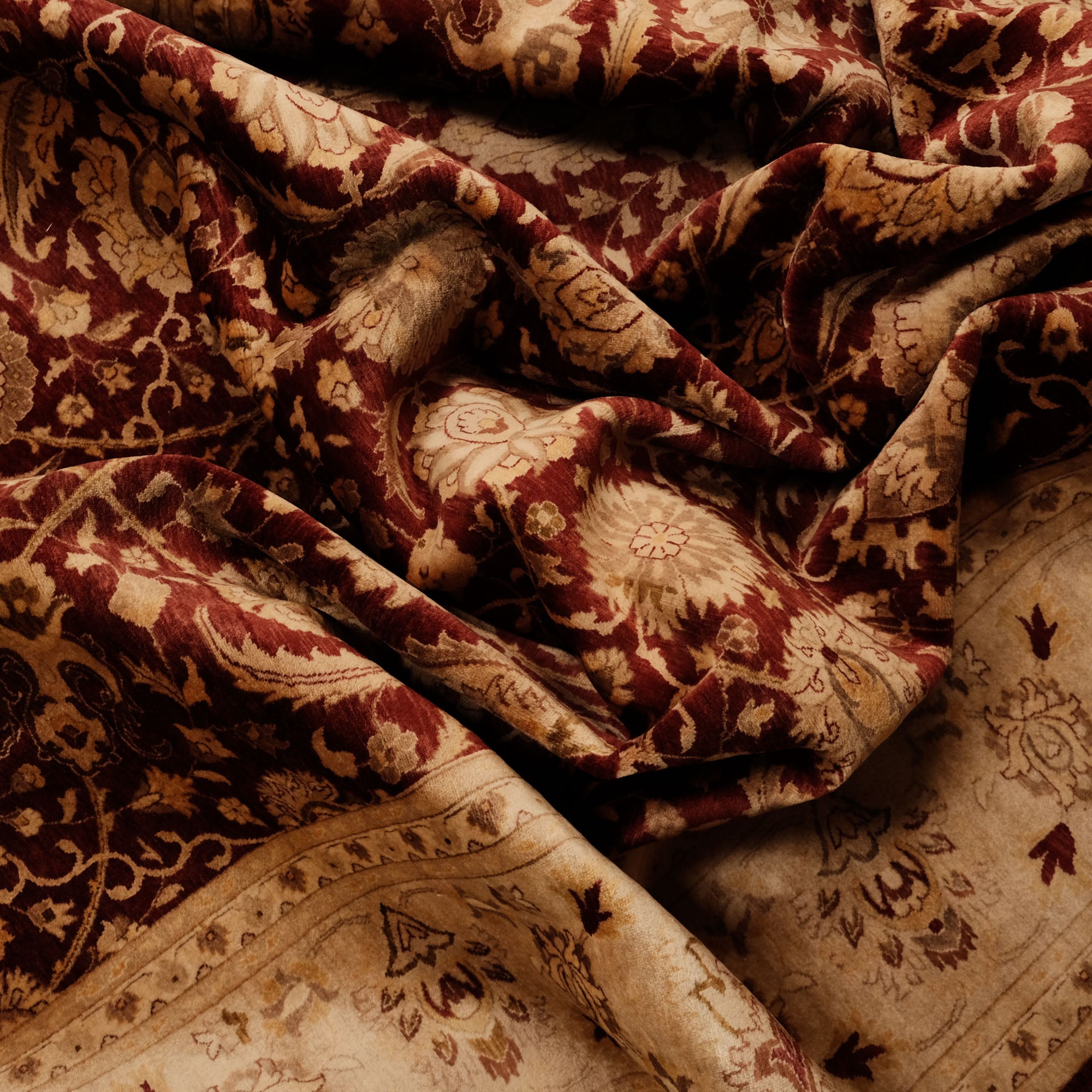 Bu zarif halı, Hindistan ustalarının ellerinde hayat bulur. Önceden Türkiye'de üretilen eserler, el dokuma halıların Türkiye'de azalmasıyla birlikte Hindistan'a geçmiştir. Dünya çapında bilinen yüksek kaliteli yün ve pamuk halılarının üretiminde şimdi lider üreticilerden biri haline gelmiştir. Eşsiz dokunuşlarıyla, Hindistan'ın dokuma ustaları, halının her düğümüne tarihinin ve kültürünün ruhunu işler.