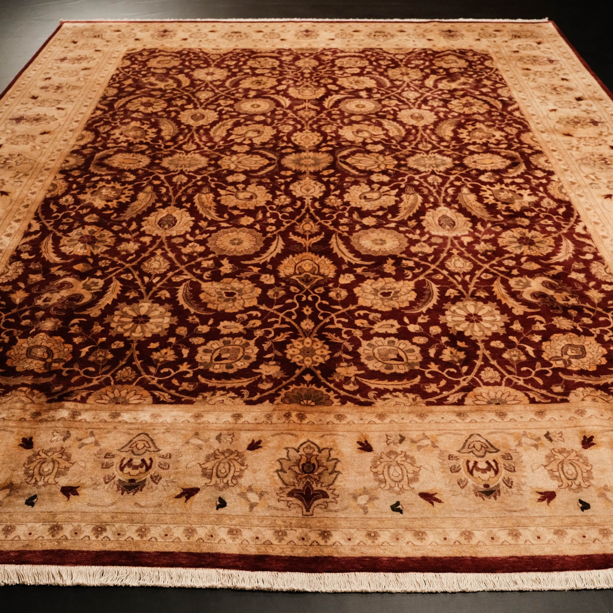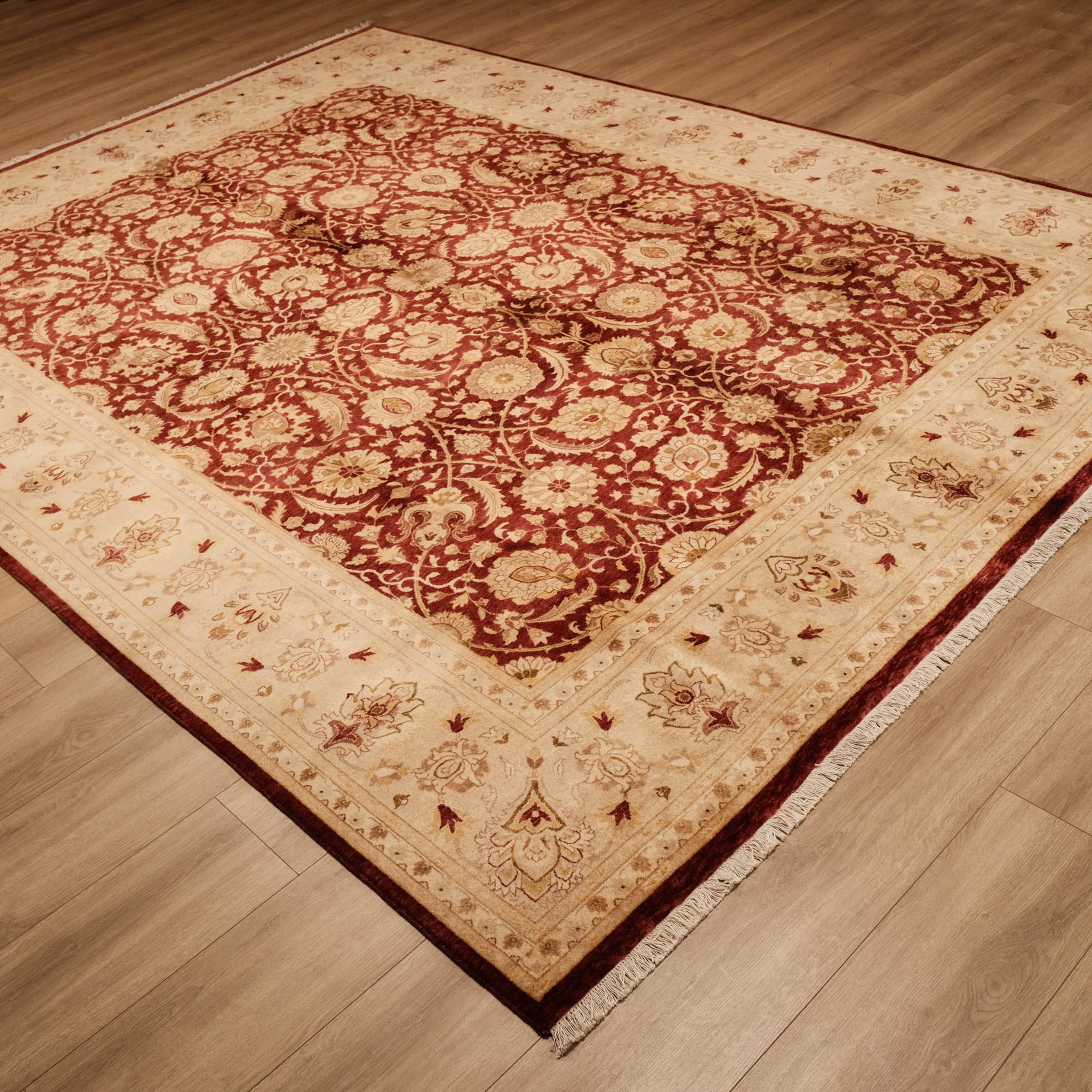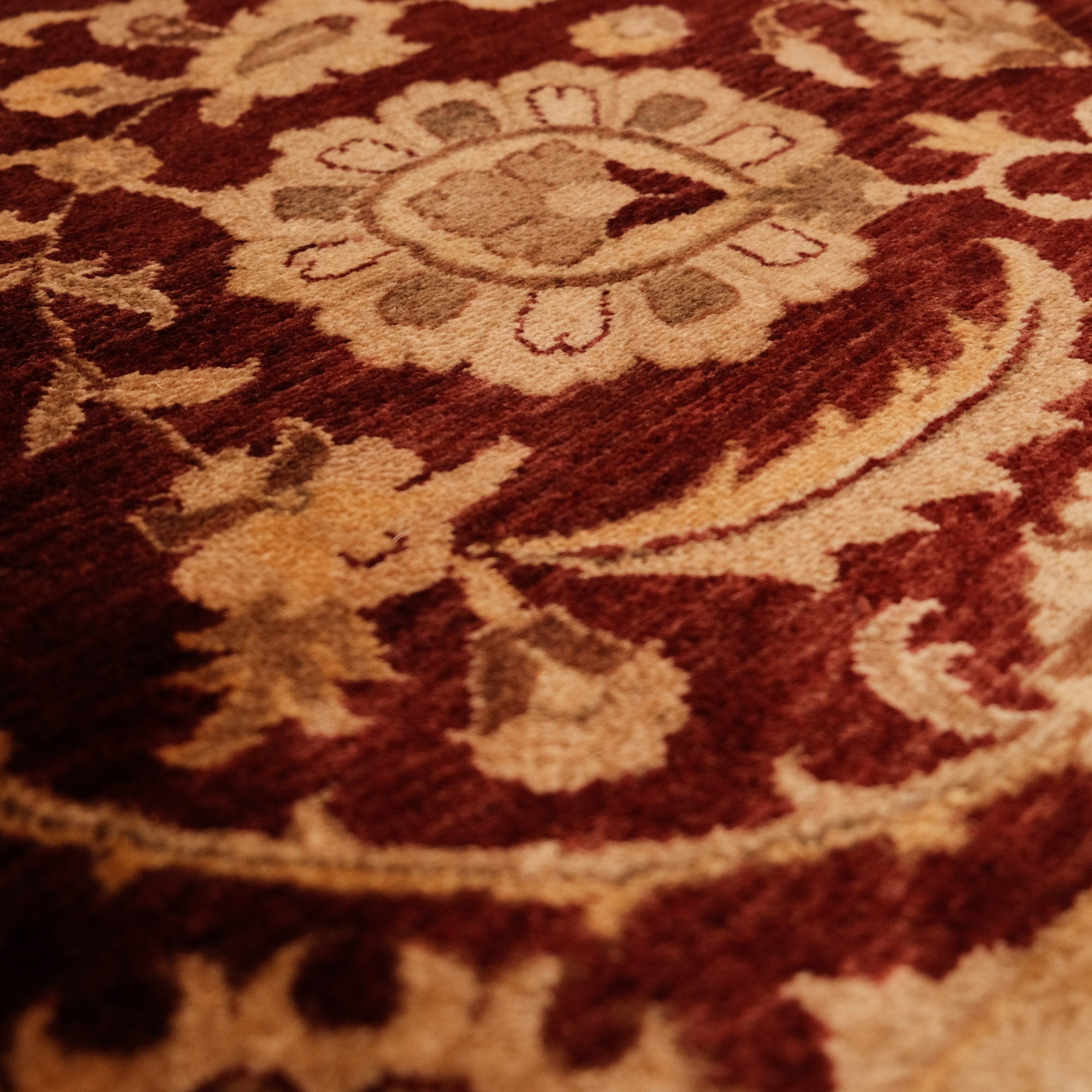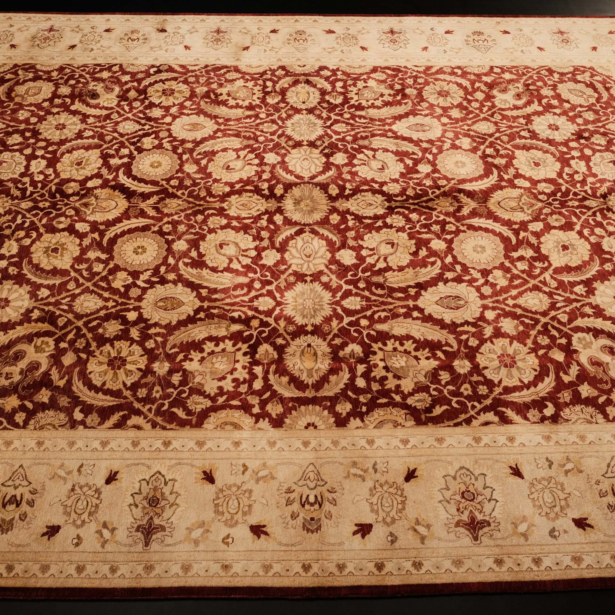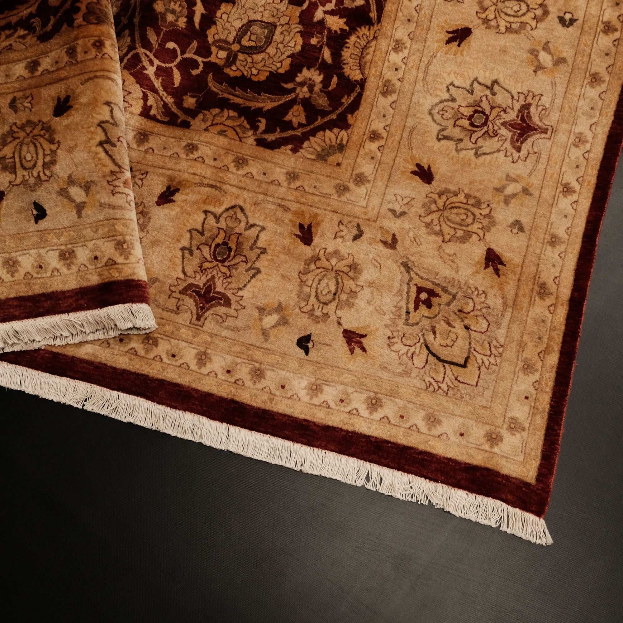 Yatak odasında, salonunuzda veya çalışma odanızda, göz alıcı renkleri ve etkileyici desenleriyle dikkat çeken bir sanat eseri sizleri bekliyor. El Dokuma Uşak Desenli Klasik Bordo Halı, kaliteli ipliklerin zarif birleşimiyle yaşam alanlarınızı adeta bir galeriye çevirir. Merkezindeki derin bordo tonu, kenarlarındaki bej ve altın sarısı tonları, klasik Uşak desenlerinin güzelliğini ve zarafetini gözler önüne serer. Manchester ipi ve yüksek kalite yünün mükemmel uyumu, halının dayanıklılığını ve ihtişamını garanti eder. Bu eşsiz sanat eseri, Hindistan'da usta eller tarafından hayata geçirilmiştir.