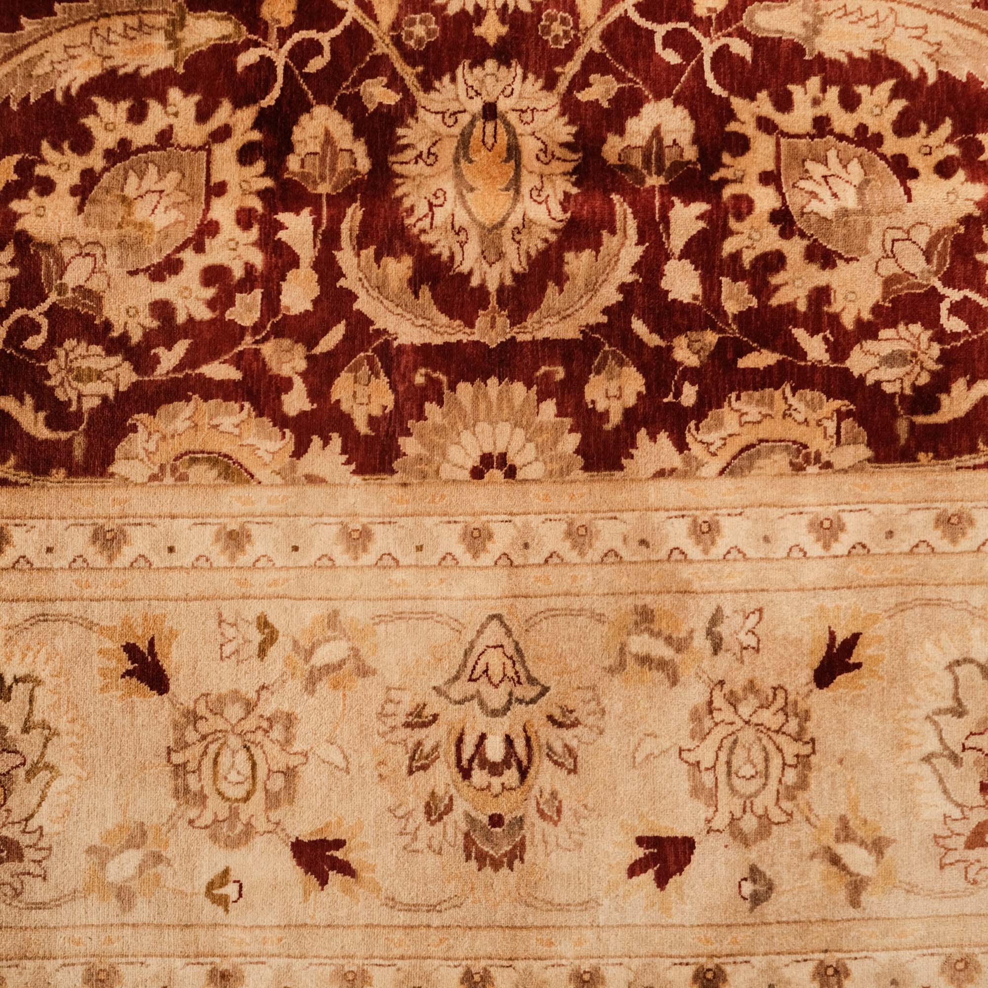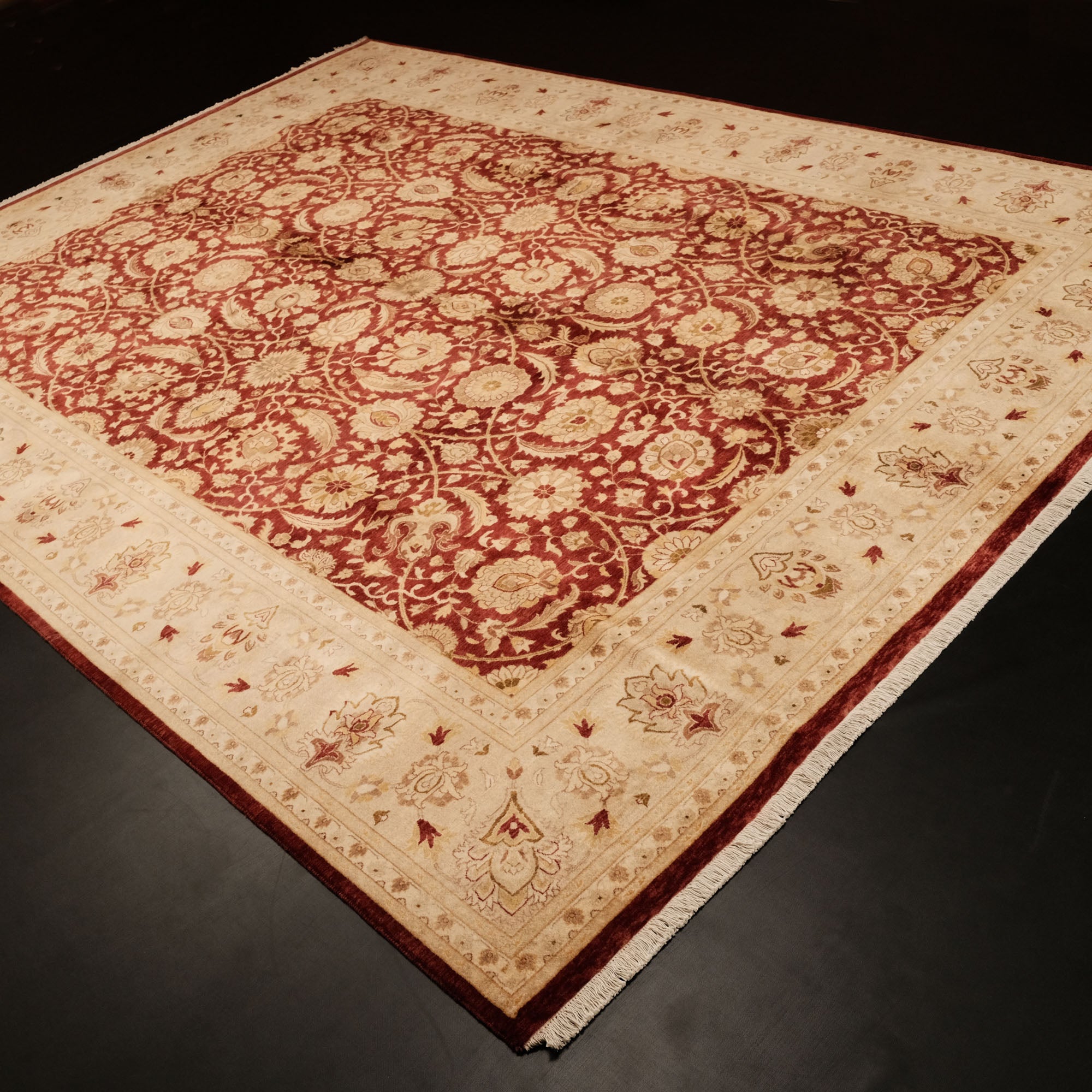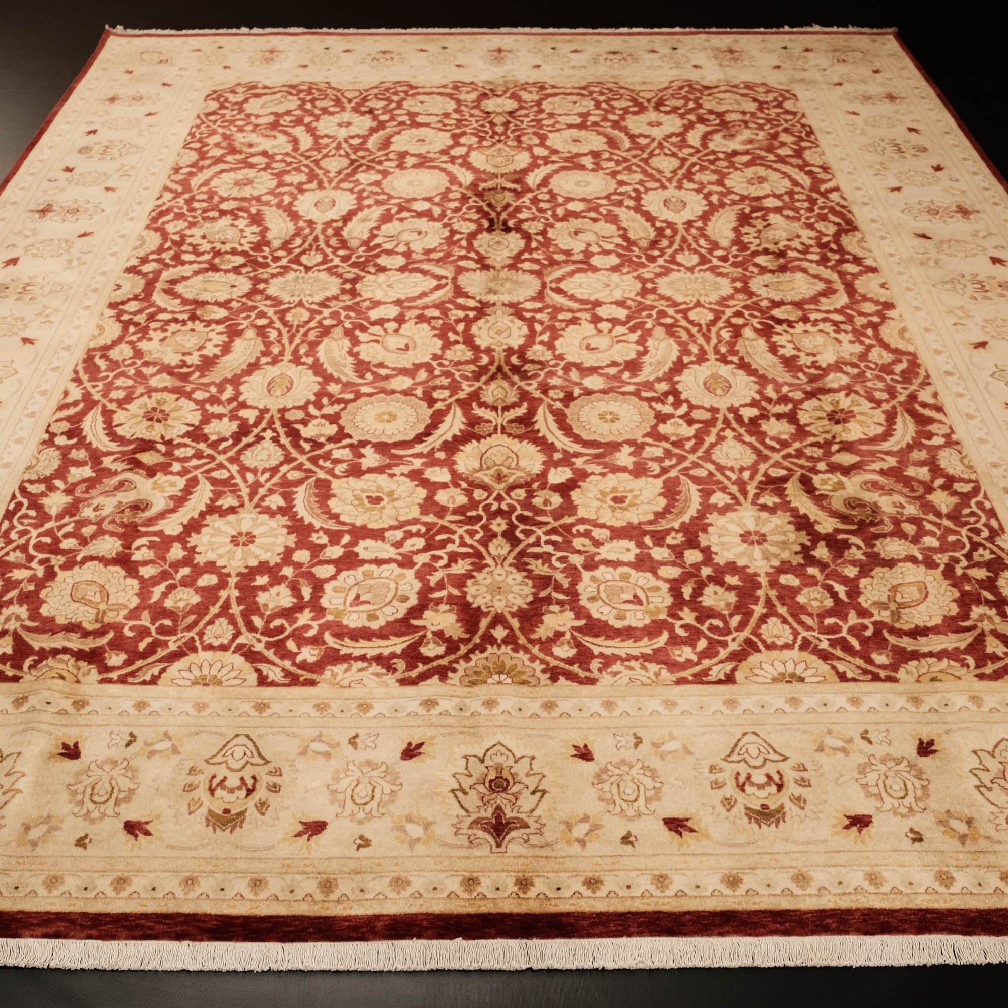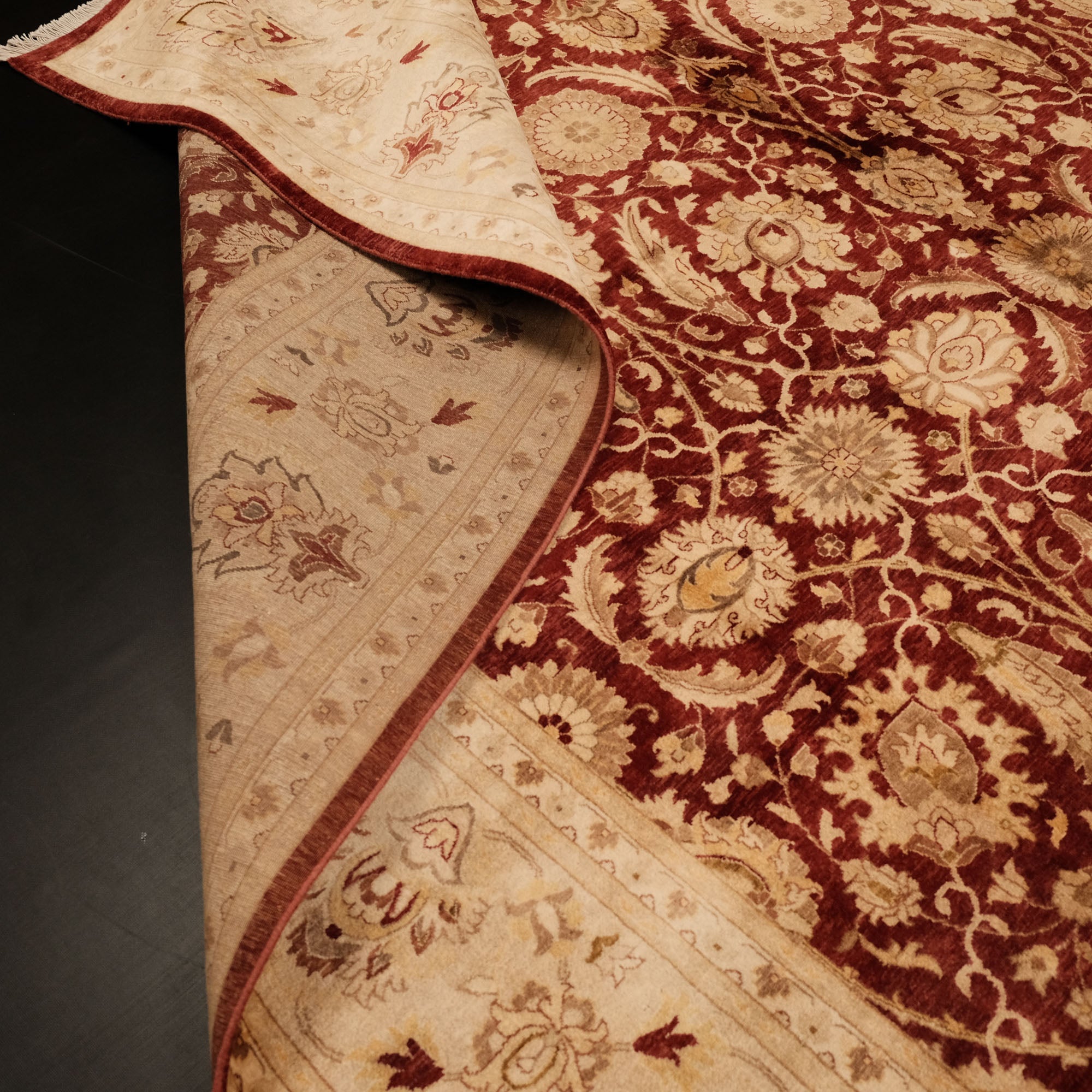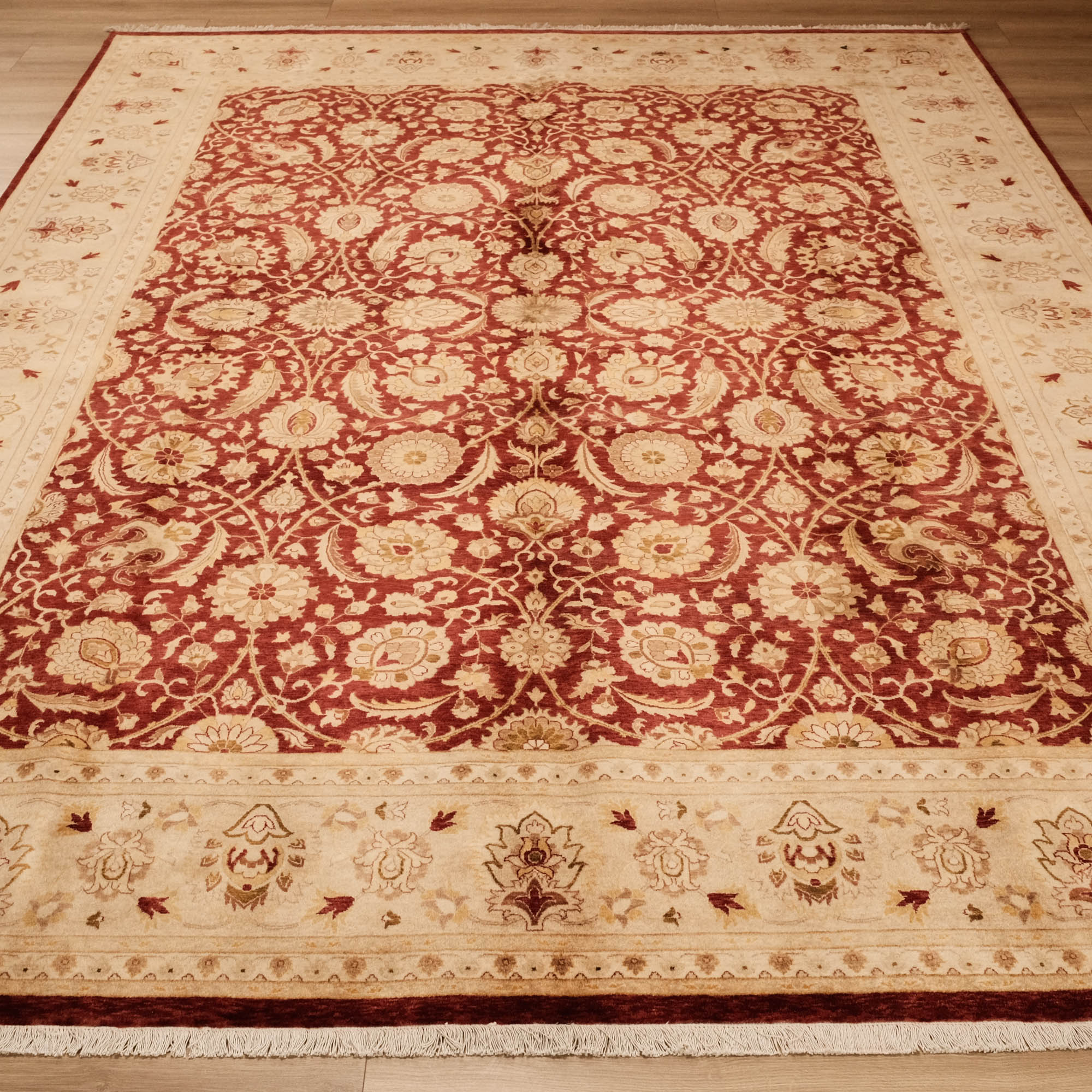 Yatak odasında, salonunuzda veya çalışma odanızda, göz alıcı renkleri ve etkileyici desenleriyle dikkat çeken bir sanat eseri sizleri bekliyor. El Dokuma Uşak Desenli Klasik Bordo Halı, kaliteli ipliklerin zarif birleşimiyle yaşam alanlarınızı adeta bir galeriye çevirir. Merkezindeki derin bordo tonu, kenarlarındaki bej ve altın sarısı tonları, klasik Uşak desenlerinin güzelliğini ve zarafetini gözler önüne serer. Manchester ipi ve yüksek kalite yünün mükemmel uyumu, halının dayanıklılığını ve ihtişamını garanti eder. Bu eşsiz sanat eseri, Hindistan'da usta eller tarafından hayata geçirilmiştir.