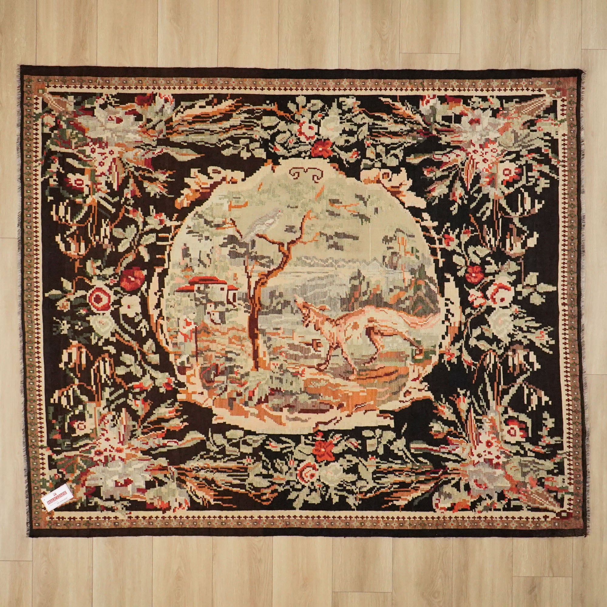 Karabağ Desenli El Dokuma Siyah Yün Kilim, ortasında doğanın huzurlu bir sahnesini andıran figüratif deseni ve etrafını saran çiçek motifleriyle adeta bir tablo gibi görünür. Siyah zemin Karabağ kilimlerinin en karakteristik özelliği olarak öne çıkarken koyu fonun üzerine işlenen kırmızı, yeşil ve krem tonları dramatik bir kontrast yaratır. Geçmişte duvarlarda da tablo niyetine kullanılan Karabağ kilimleri bugün de kış bahçelerinde, masif ahşaplarla döşenmiş salonlarda ya da endüstriyel mobilyaların hâkim olduğu modern alanlara otantik bir ruh katar.