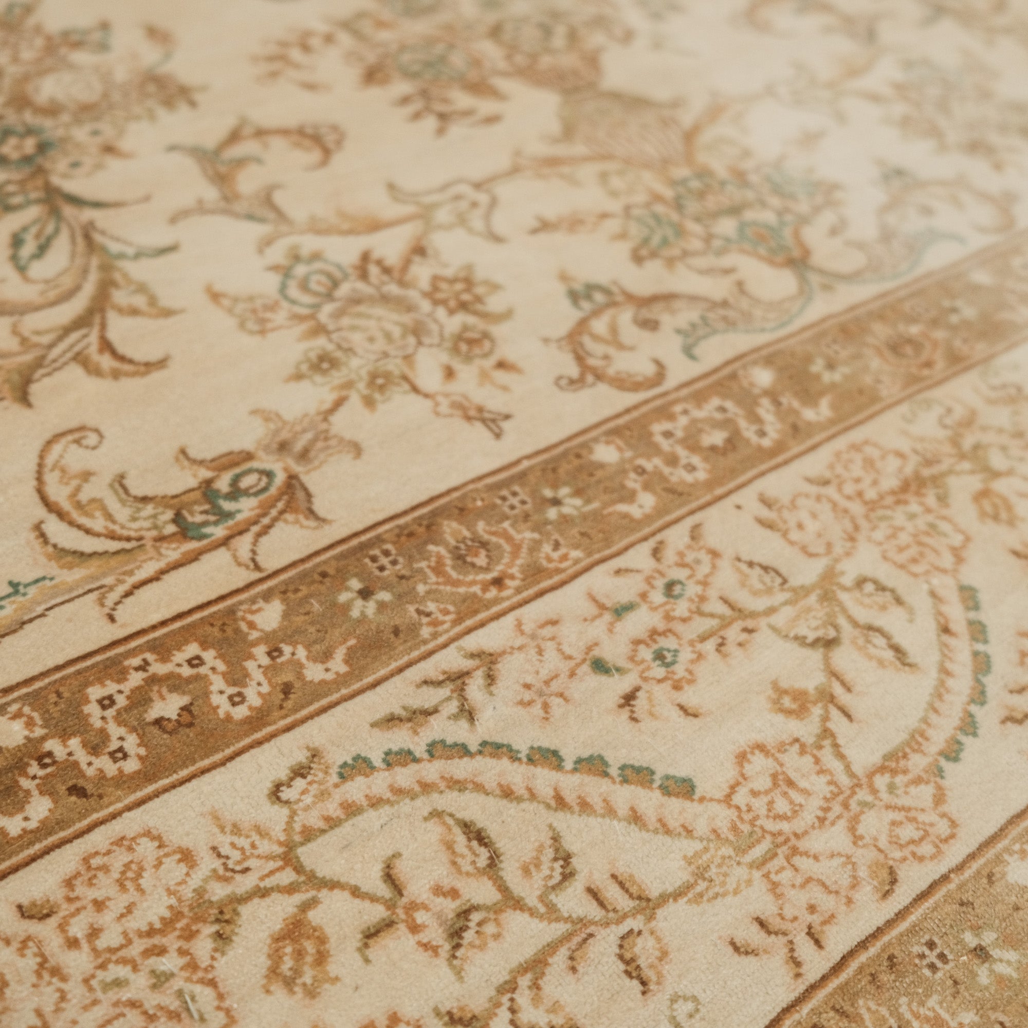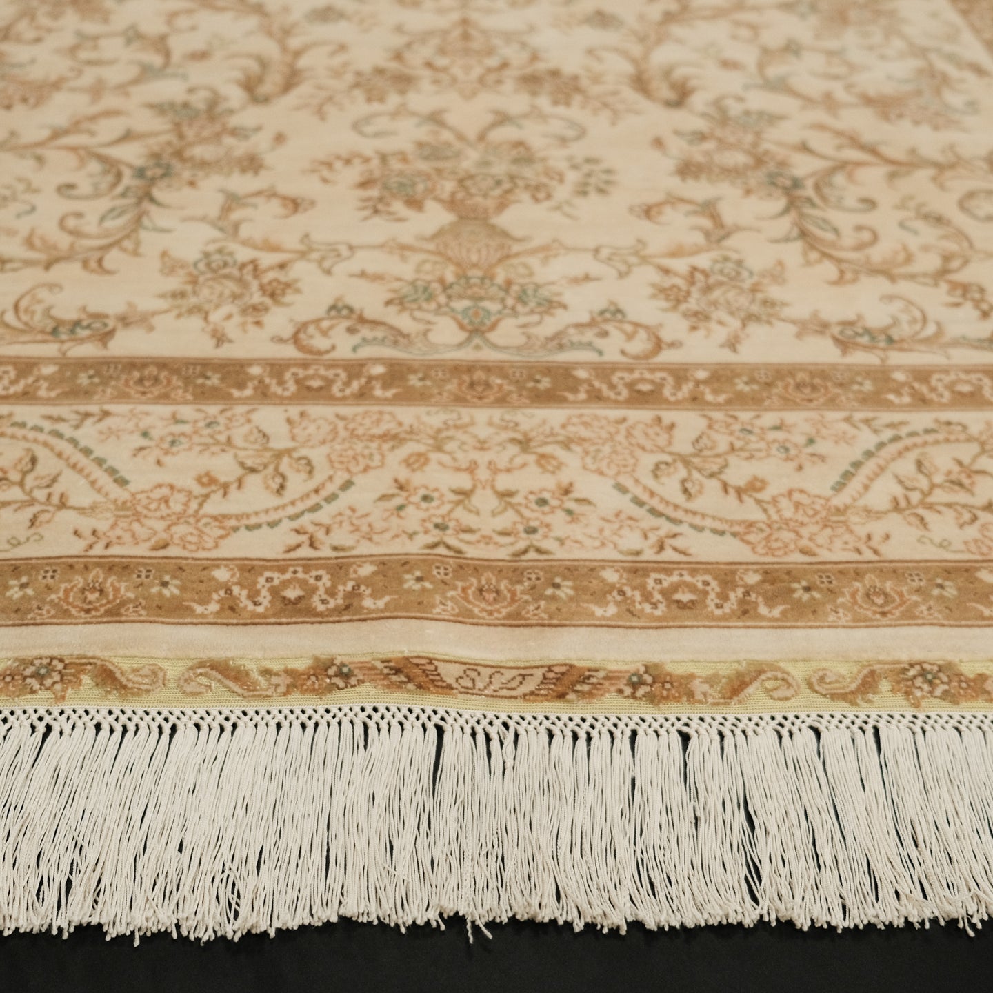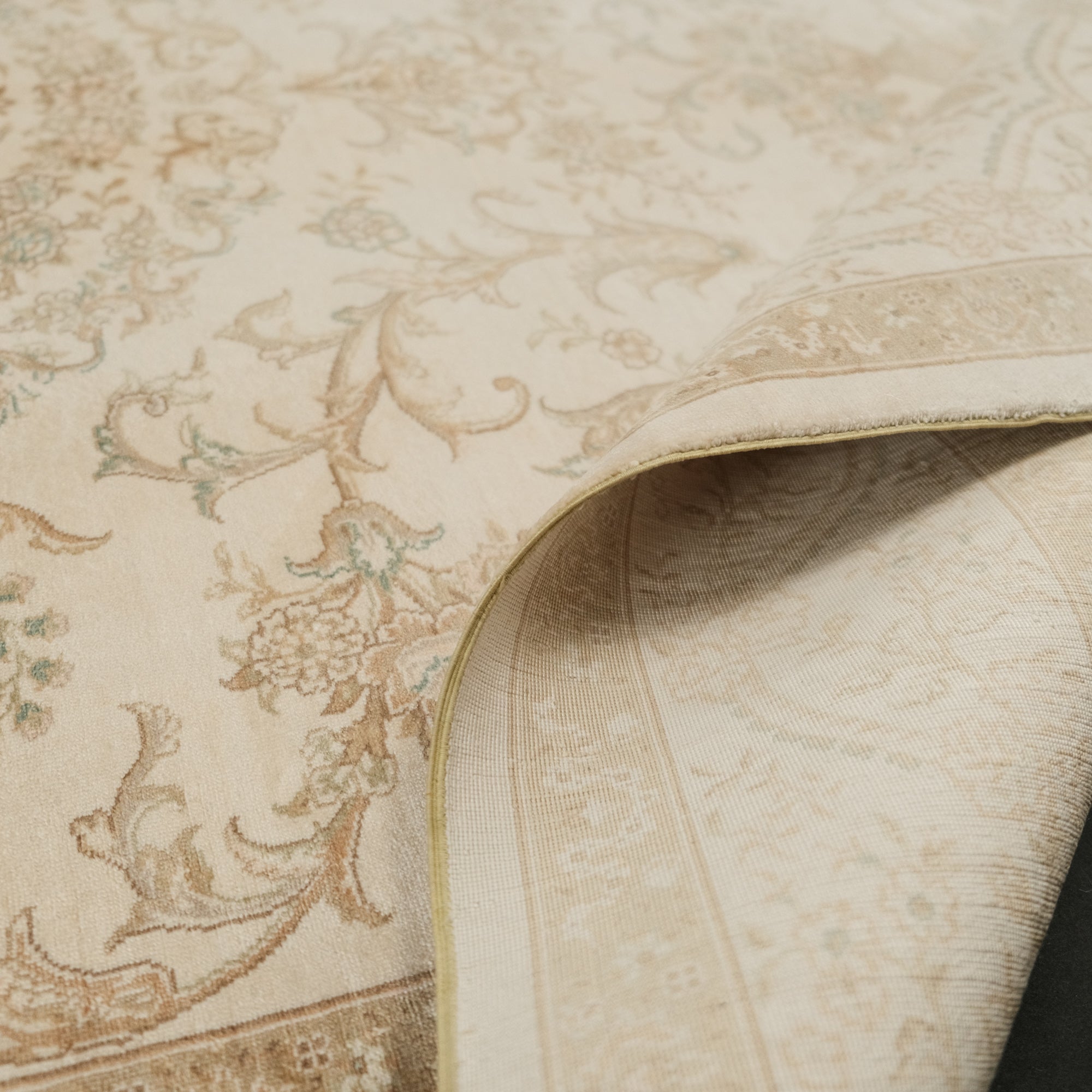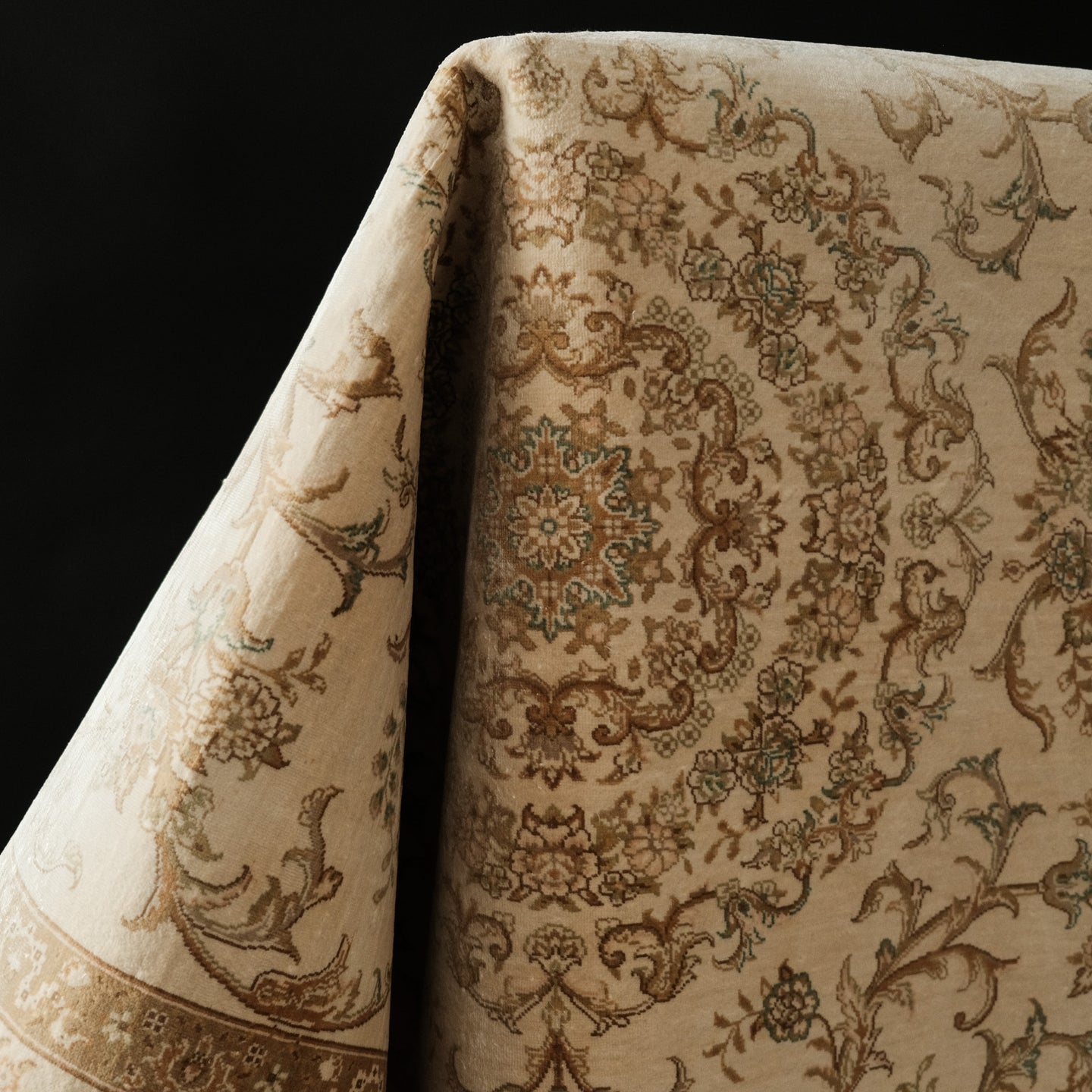 Madalyon Desenli Krem El Dokuma İpek Halı, merkezindeki desenle söze gerek bırakmadan konuşur. 124 x 183 cm ölçüsündeki ipek yüzey, tam ortasında yer alan madalyonla tüm bakışları üzerine toplar; çevresini saran kıvrımlı yapraklar ve ince çiçek motifleri ise bu sessiz ihtişamı zarafetle tamamlar. Krem tonlarıyla bezenmiş alan, ışıkla buluştuğunda yumuşak bir parlaklık kazanır ve ortama hafif bir ışıltı yayar. Her bir santimetrekaresinde saf ipek iplikle atılmış düğümler, sabırla ve ustalıkla oluşturulmuştur. Aylar süren dokuma sürecinde desenlerin belirginliğini sağlamak adına yoğun düğüm sıklığı kullanılmıştır.