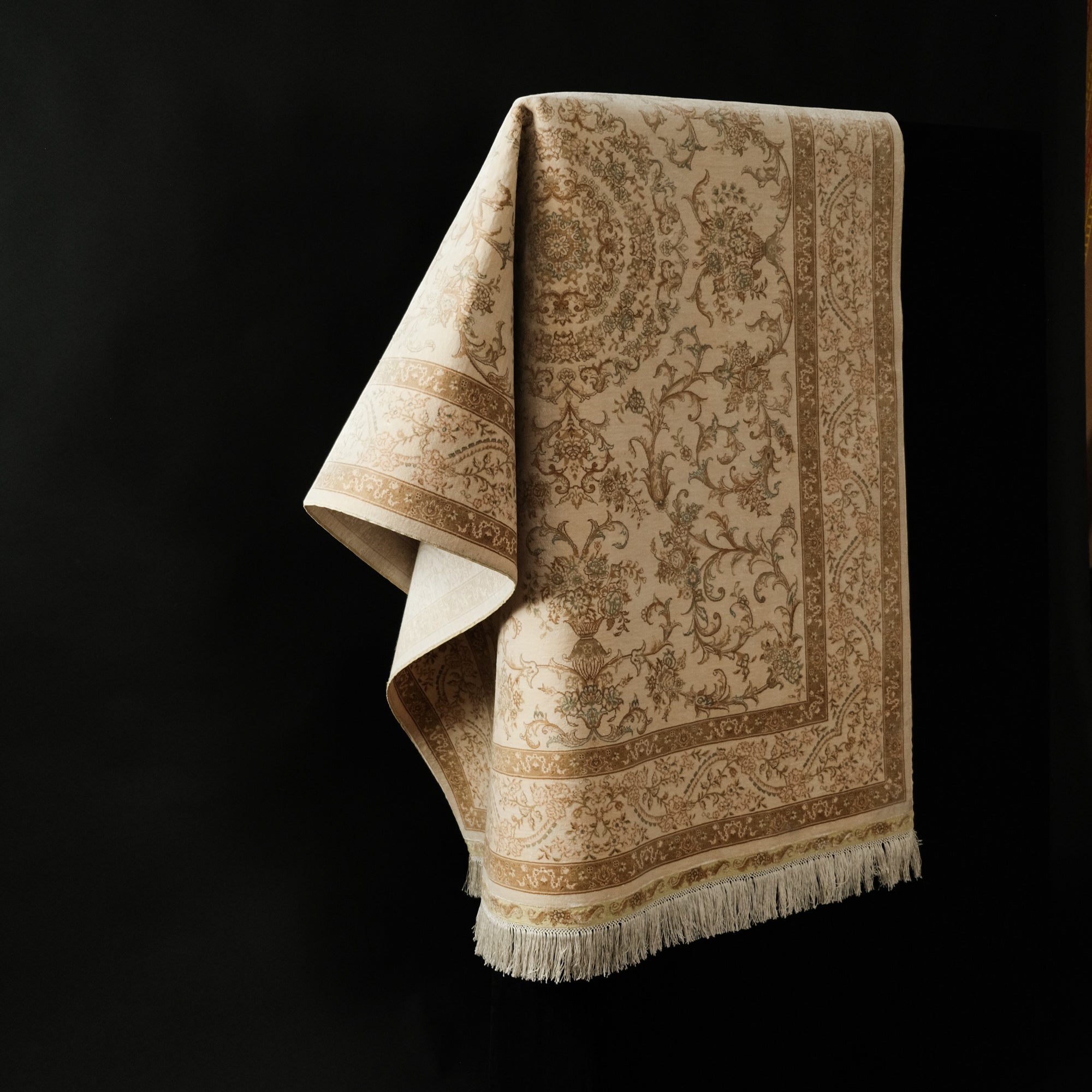 Madalyon Desenli Krem El Dokuma İpek Halı; ceviz, akçaağaç gibi doğal dokularla bütünlük sağlar; pirinç detaylı klasik mobilyalarda ise tam anlamıyla tamamlayıcı bir role bürünür. Duvara asıldığında tablo gibi durur, zemine serildiğinde mekânın karakterini baştan tanımlar. Çin’in yüzyıllardır süregelen ipek işçiliğinden gelen bu dokuma, emeği, zamanı ve sanatı bir arada taşır. Gösterişli değil, ama kendinden emin bir duruşa sahip olduğu için bulunduğu her alanda odak noktasına dönüşür. Salon girişleri, giriş antreleri ve yatak odalarında kullanıma uygundur.