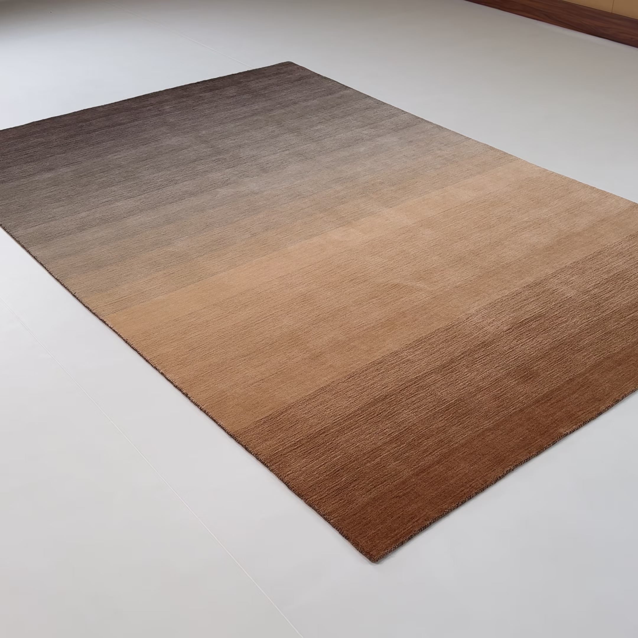 Sade Desenli Kahverengi Yün Tezgah Dokuma Halı, kahverenginin en sıcak ve toprakla bağ kuran tonlarını, yumuşak bir geçişle griye doğru uzanarak sunar. Tonlar halının yüzeyinde adeta birbirine karışır; ne sert sınırlar vardır ne de keskin ayrımlar, yalnızca dingin bir geçiş ve doğal bir bütünlük hissi. Kahverengi tonu için sıcacık, tok ve iştah açan bir görünüm taşıdığı için “kakaolu kek gibi halı” benzetmesini yapabiliriz.