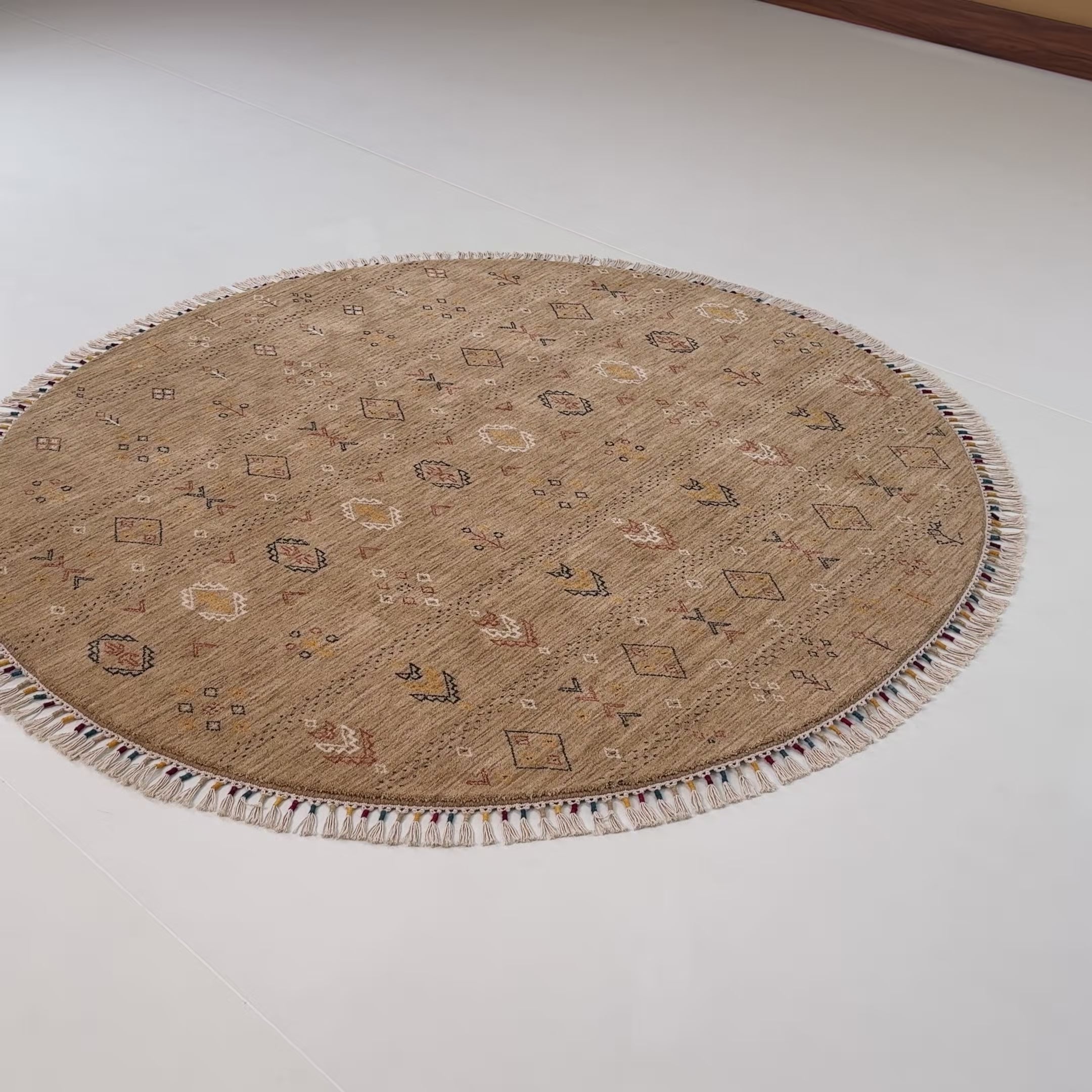 Urkum Serisi Otantik Desenli Bej Yün Tezgah Dokuma Yuvarlak Halı