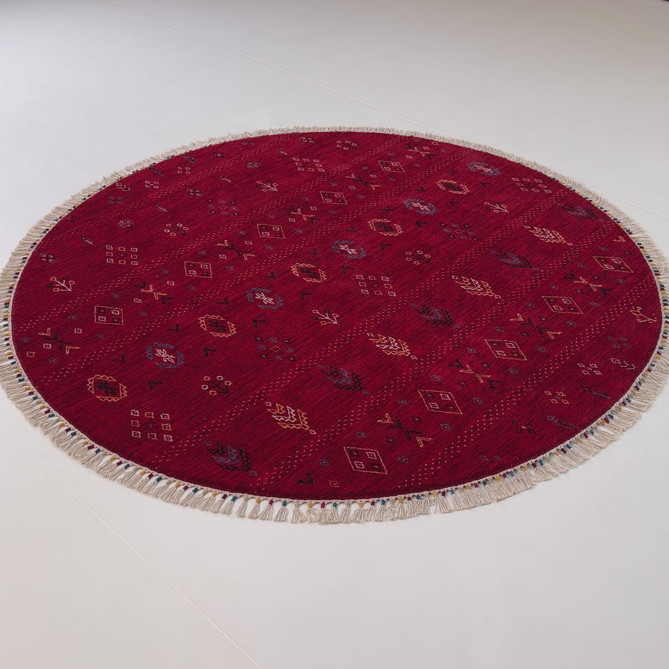 Urkum Serisi Otantik Desenli Kırmızı Yün Tezgah Dokuma Yuvarlak Halı