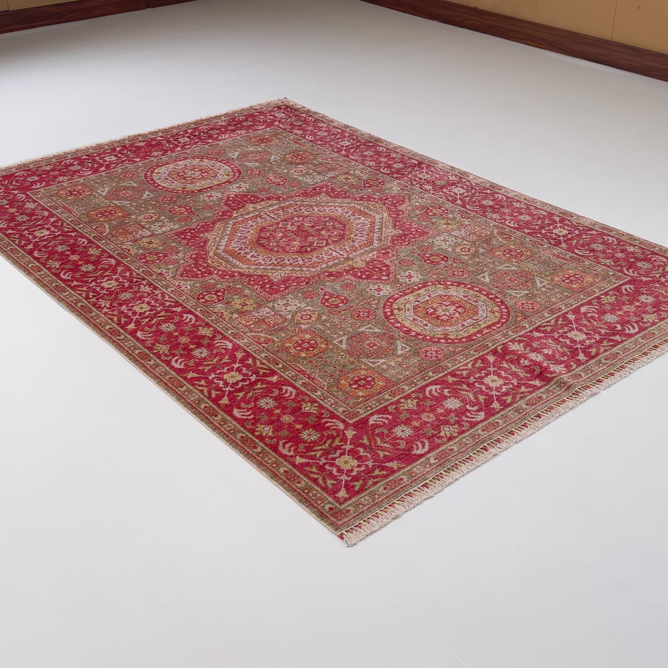 Zade Serisi Memlük Desenli Kırmızı Yeşil Tezgah Dokuma Doğal Halı